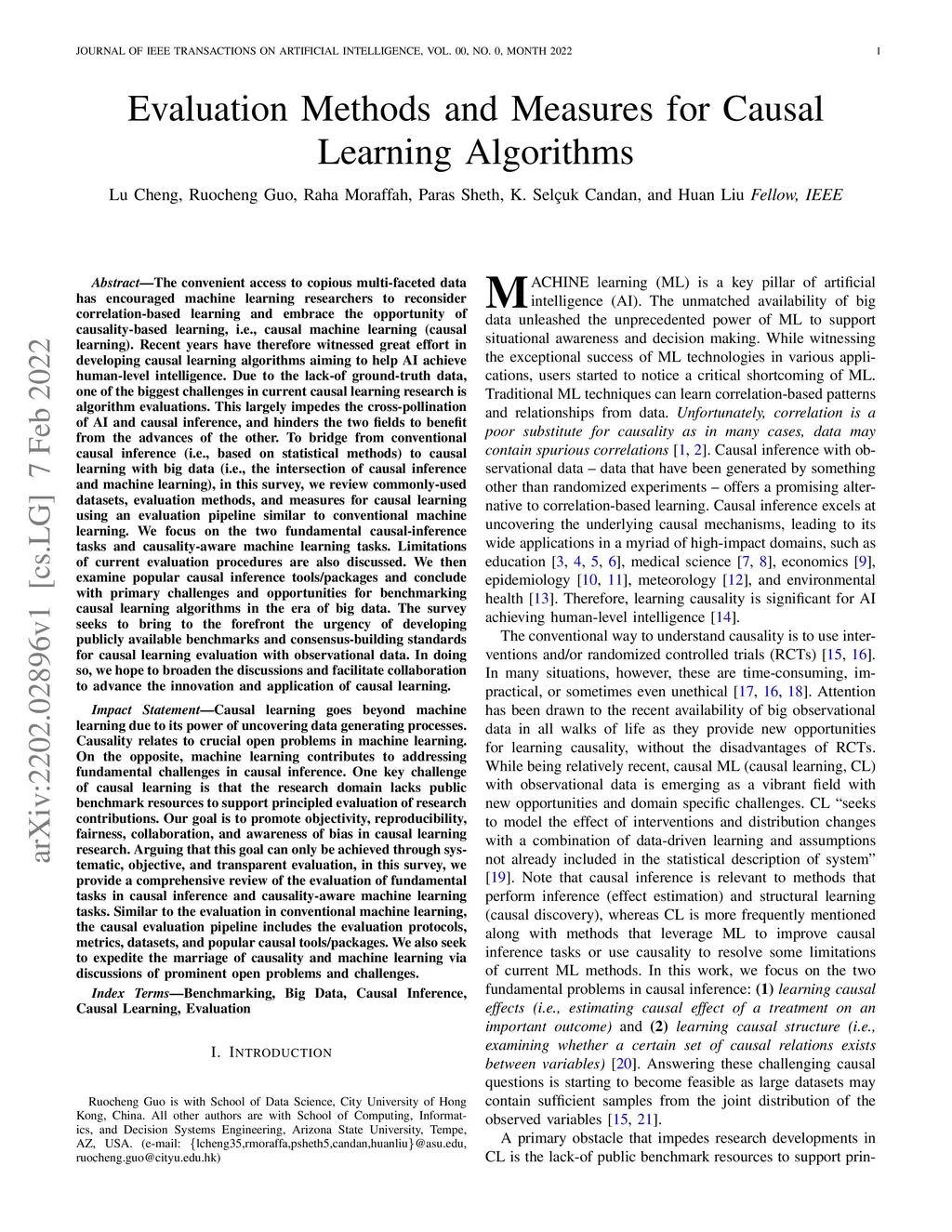 The convenient access to copious multi-faceted data has encouraged machine learning researchers to reconsider correlation-based learning and embrace the opportunity of causality-based learning, i.e., causal machine learning (causal learning). Recent years have therefore witnessed great effort in developing causal learning algorithms aiming to help AI achieve human-level intelligence. Due to the lack-of ground-truth data, one of the biggest challenges in current causal learning research is algorithm evaluations. This largely impedes the cross-pollination of AI and causal inference, and hinders the two fields to benefit from the advances of the other. To bridge from conventional causal inference (i.e., based on statistical methods) to causal learning with big data (i.e., the intersection of causal inference and machine learning), in this survey, we review commonly-used datasets, evaluation methods, and measures for causal learning using an evaluation pipeline similar to conventional machine learning. We focus on the two fundamental causal-inference tasks and causality-aware machine learning tasks. Limitations of current evaluation procedures are also discussed. We then examine popular causal inference tools/packages and conclude with primary challenges and opportunities for benchmarking causal learning algorithms in the era of big data. The survey seeks to bring to the forefront the urgency of developing publicly available benchmarks and consensus-building standards for causal learning evaluation with observational data. In doing so, we hope to broaden the discussions and facilitate collaboration to advance the innovation and application of causal learning.
