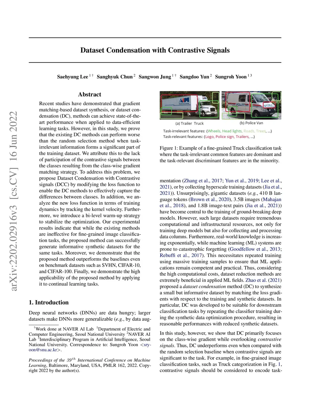 Recent studies have demonstrated that gradient matching-based dataset synthesis, or dataset condensation (DC), methods can achieve state-of-the-art performance when applied to data-efficient learning tasks. However, in this study, we prove that the existing DC methods can perform worse than the random selection method when task-irrelevant information forms a significant part of the training dataset. We attribute this to the lack of participation of the contrastive signals between the classes resulting from the class-wise gradient matching strategy. To address this problem, we propose Dataset Condensation with Contrastive signals (DCC) by modifying the loss function to enable the DC methods to effectively capture the differences between classes. In addition, we analyze the new loss function in terms of training dynamics by tracking the kernel velocity. Furthermore, we introduce a bi-level warm-up strategy to stabilize the optimization. Our experimental results indicate that while the existing methods are ineffective for fine-grained image classification tasks, the proposed method can successfully generate informative synthetic datasets for the same tasks. Moreover, we demonstrate that the proposed method outperforms the baselines even on benchmark datasets such as SVHN, CIFAR-10, and CIFAR-100. Finally, we demonstrate the high applicability of the proposed method by applying it to continual learning tasks.