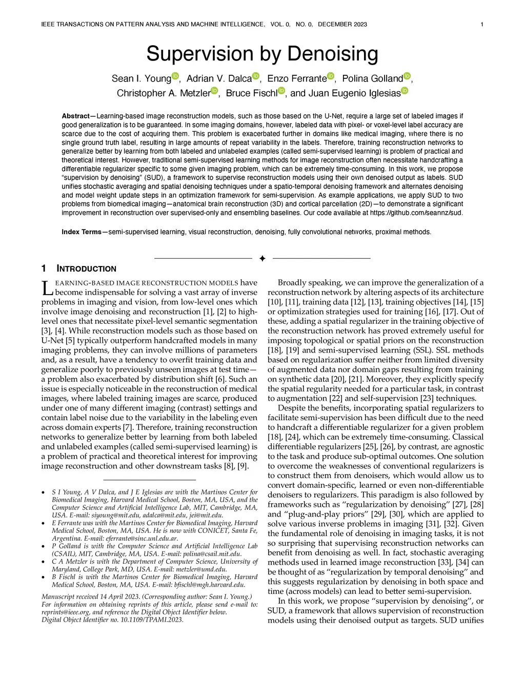Learning-based image reconstruction models, such as those based on the U-Net, require a large set of labeled images if good generalization is to be guaranteed. In some imaging domains, however, labeled data with pixel- or voxel-level label accuracy are scarce due to the cost of acquiring them. This problem is exacerbated further in domains like medical imaging, where there is no single ground truth label, resulting in large amounts of repeat variability in the labels. Therefore, training reconstruction networks to generalize better by learning from both labeled and unlabeled examples (called semi-supervised learning) is problem of practical and theoretical interest. However, traditional semi-supervised learning methods for image reconstruction often necessitate handcrafting a differentiable regularizer specific to some given imaging problem, which can be extremely time-consuming. In this work, we propose "supervision by denoising" (SUD), a framework that enables us to supervise reconstruction models using their own denoised output as soft labels. SUD unifies stochastic averaging and spatial denoising techniques under a spatio-temporal denoising framework and alternates denoising and model weight update steps in an optimization framework for semi-supervision. As example applications, we apply SUD to two problems arising from biomedical imaging -- anatomical brain reconstruction (3D) and cortical parcellation (2D) -- to demonstrate a significant improvement in the image reconstructions over supervised-only and stochastic averaging baselines.