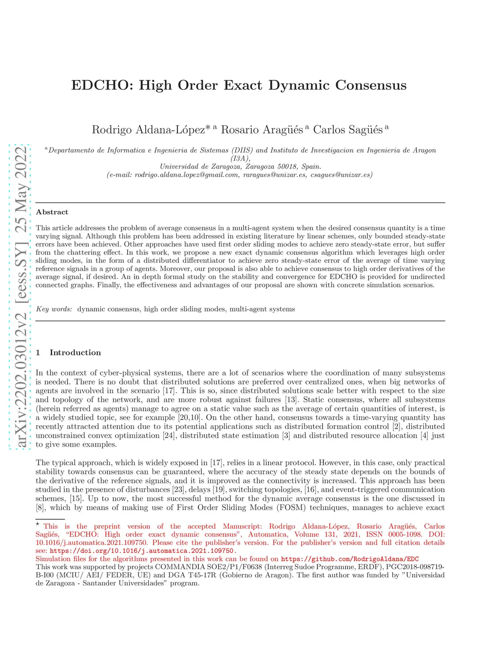 This article addresses the problem of average consensus in a multi-agent system when the desired consensus quantity is a time varying signal. Although this problem has been addressed in existing literature by linear schemes, only bounded steady-state errors have been achieved. Other approaches have used first order sliding modes to achieve zero steady-state error, but suffer from the chattering effect. In this work, we propose a new exact dynamic consensus algorithm which leverages high order sliding modes, in the form of a distributed differentiator to achieve zero steady-state error of the average of time varying reference signals in a group of agents. Moreover, our proposal is also able to achieve consensus to high order derivatives of the average signal, if desired. An in depth formal study on the stability and convergence for EDCHO is provided for undirected connected graphs. Finally, the effectiveness and advantages of our proposal are shown with concrete simulation scenarios.