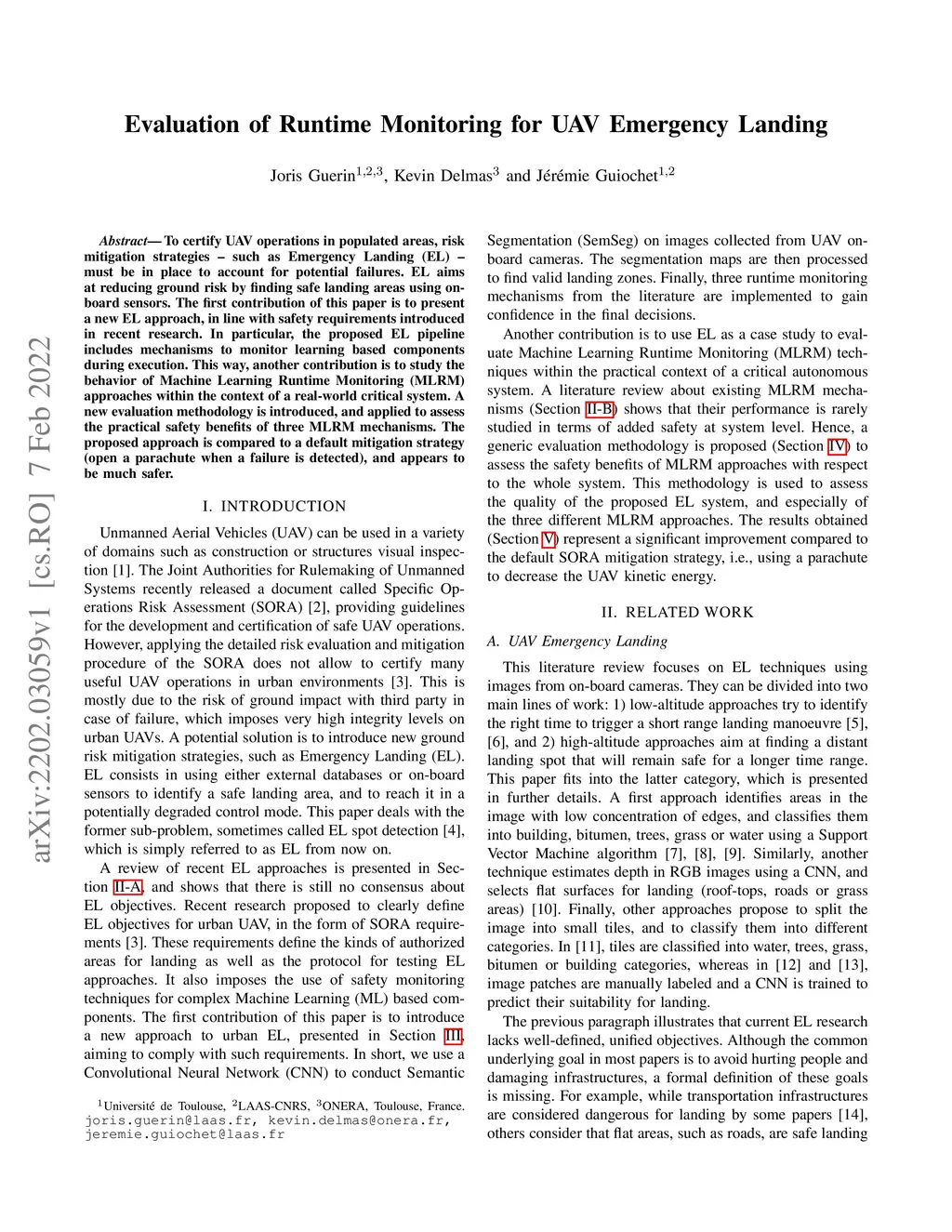 To certify UAV operations in populated areas, risk mitigation strategies -- such as Emergency Landing (EL) -- must be in place to account for potential failures. EL aims at reducing ground risk by finding safe landing areas using on-board sensors. The first contribution of this paper is to present a new EL approach, in line with safety requirements introduced in recent research. In particular, the proposed EL pipeline includes mechanisms to monitor learning based components during execution. This way, another contribution is to study the behavior of Machine Learning Runtime Monitoring (MLRM) approaches within the context of a real-world critical system. A new evaluation methodology is introduced, and applied to assess the practical safety benefits of three MLRM mechanisms. The proposed approach is compared to a default mitigation strategy (open a parachute when a failure is detected), and appears to be much safer.