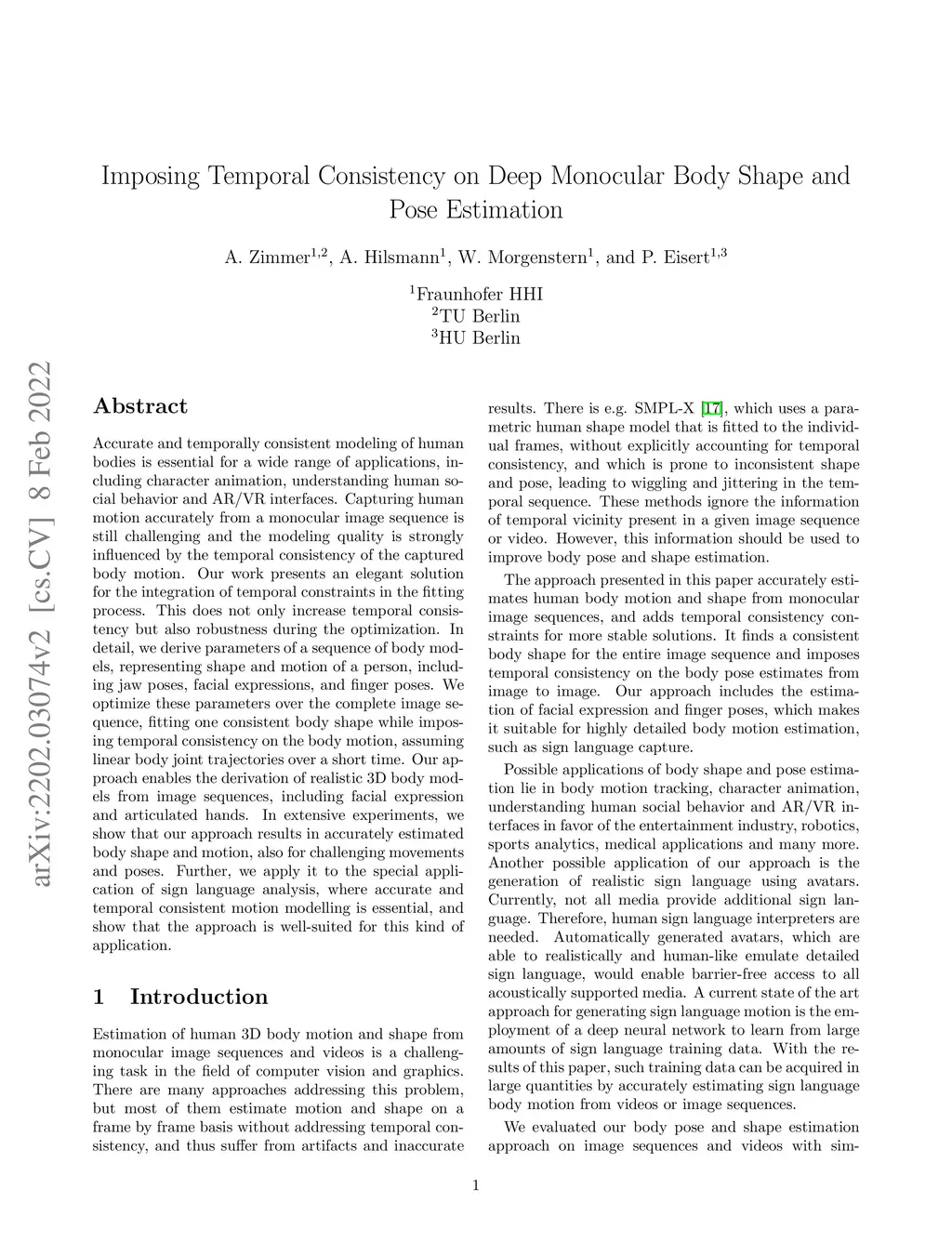 Accurate and temporally consistent modeling of human bodies is essential for a wide range of applications, including character animation, understanding human social behavior and AR/VR interfaces. Capturing human motion accurately from a monocular image sequence is still challenging and the modeling quality is strongly influenced by the temporal consistency of the captured body motion. Our work presents an elegant solution for the integration of temporal constraints in the fitting process. This does not only increase temporal consistency but also robustness during the optimization. In detail, we derive parameters of a sequence of body models, representing shape and motion of a person, including jaw poses, facial expressions, and finger poses. We optimize these parameters over the complete image sequence, fitting one consistent body shape while imposing temporal consistency on the body motion, assuming linear body joint trajectories over a short time. Our approach enables the derivation of realistic 3D body models from image sequences, including facial expression and articulated hands. In extensive experiments, we show that our approach results in accurately estimated body shape and motion, also for challenging movements and poses. Further, we apply it to the special application of sign language analysis, where accurate and temporal consistent motion modelling is essential, and show that the approach is well-suited for this kind of application.