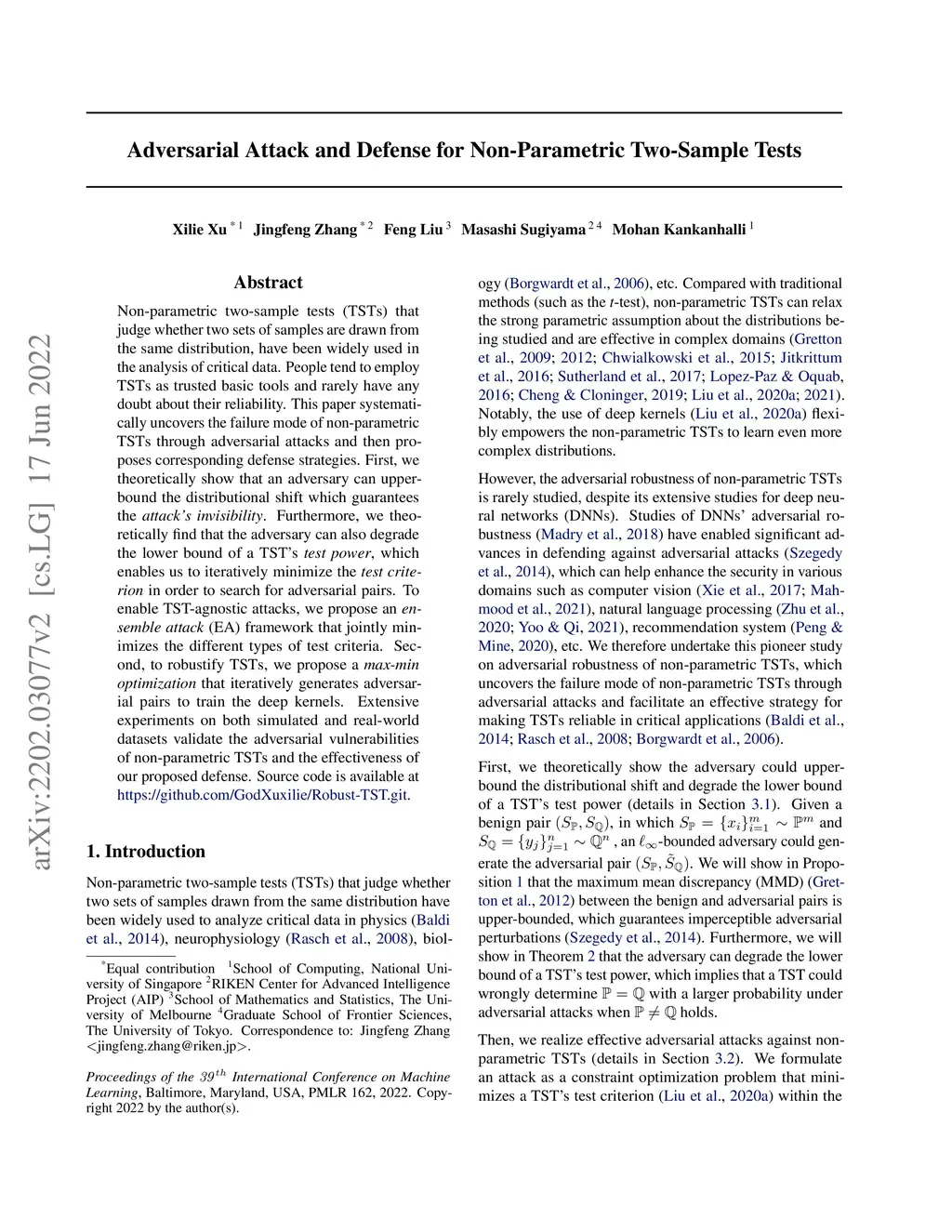 Non-parametric two-sample tests (TSTs) that judge whether two sets of samples are drawn from the same distribution, have been widely used in the analysis of critical data. People tend to employ TSTs as trusted basic tools and rarely have any doubt about their reliability. This paper systematically uncovers the failure mode of non-parametric TSTs through adversarial attacks and then proposes corresponding defense strategies. First, we theoretically show that an adversary can upper-bound the distributional shift which guarantees the attack's invisibility. Furthermore, we theoretically find that the adversary can also degrade the lower bound of a TST's test power, which enables us to iteratively minimize the test criterion in order to search for adversarial pairs. To enable TST-agnostic attacks, we propose an ensemble attack (EA) framework that jointly minimizes the different types of test criteria. Second, to robustify TSTs, we propose a max-min optimization that iteratively generates adversarial pairs to train the deep kernels. Extensive experiments on both simulated and real-world datasets validate the adversarial vulnerabilities of non-parametric TSTs and the effectiveness of our proposed defense. Source code is available at https://github.com/GodXuxilie/Robust-TST.git.