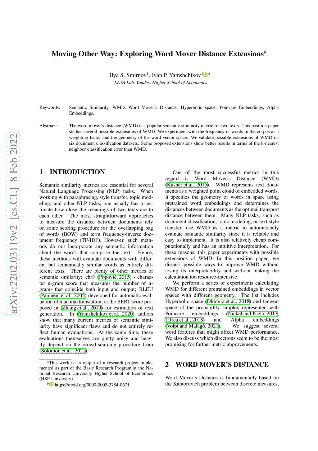 The word mover's distance (WMD) is a popular semantic similarity metric for two texts. This position paper studies several possible extensions of WMD. We experiment with the frequency of words in the corpus as a weighting factor and the geometry of the word vector space. We validate possible extensions of WMD on six document classification datasets. Some proposed extensions show better results in terms of the k-nearest neighbor classification error than WMD.