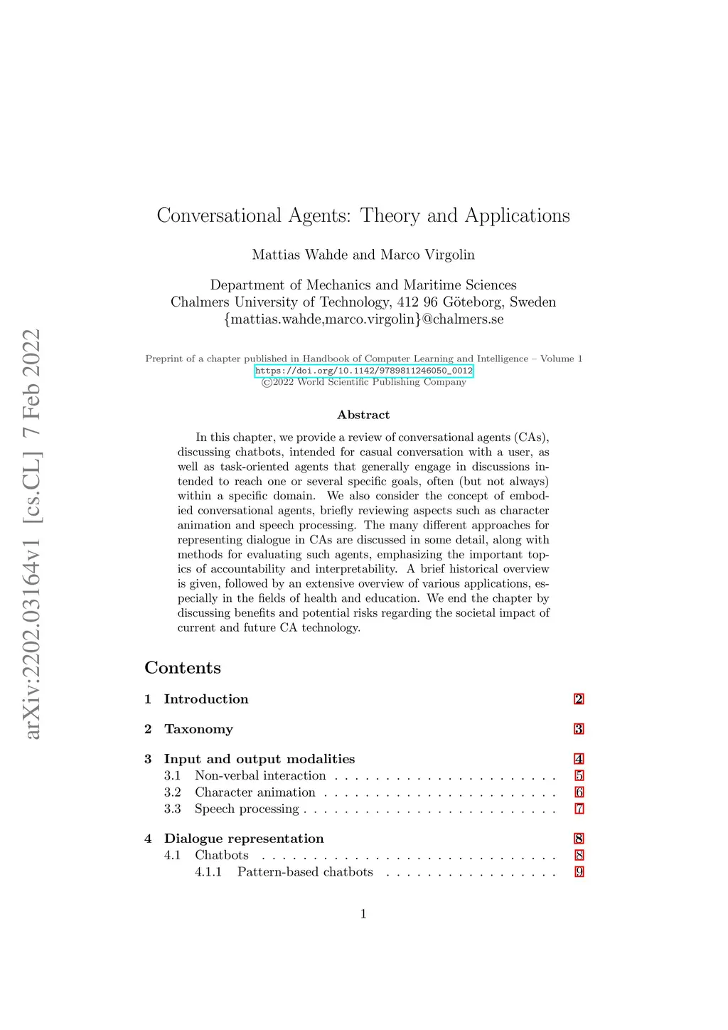 In this chapter, we provide a review of conversational agents (CAs), discussing chatbots, intended for casual conversation with a user, as well as task-oriented agents that generally engage in discussions intended to reach one or several specific goals, often (but not always) within a specific domain. We also consider the concept of embodied conversational agents, briefly reviewing aspects such as character animation and speech processing. The many different approaches for representing dialogue in CAs are discussed in some detail, along with methods for evaluating such agents, emphasizing the important topics of accountability and interpretability. A brief historical overview is given, followed by an extensive overview of various applications, especially in the fields of health and education. We end the chapter by discussing benefits and potential risks regarding the societal impact of current and future CA technology.