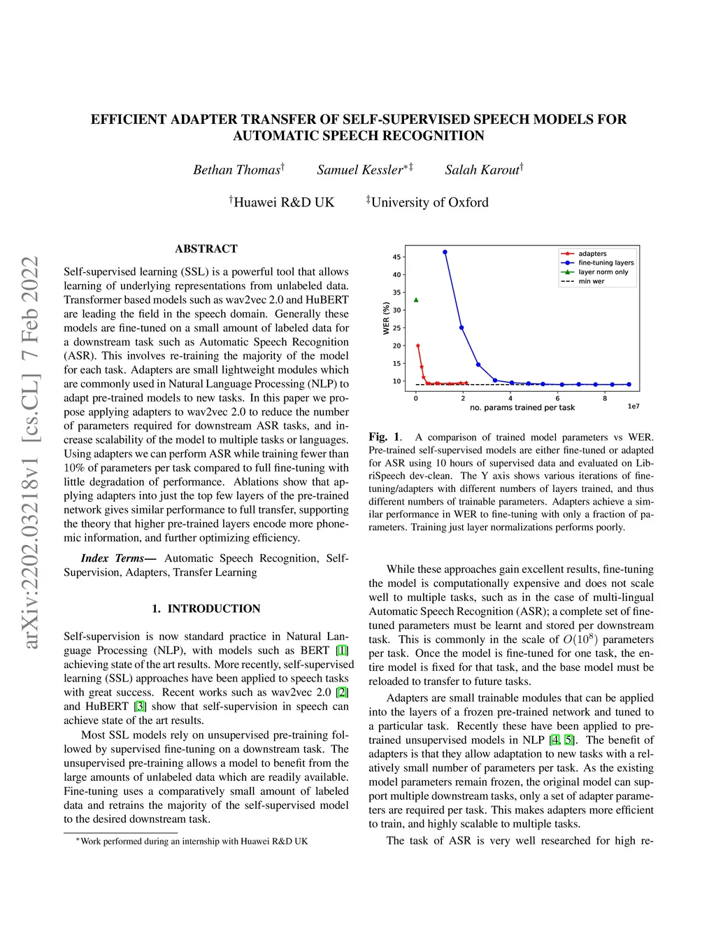 Self-supervised learning (SSL) is a powerful tool that allows learning of underlying representations from unlabeled data. Transformer based models such as wav2vec 2.0 and HuBERT are leading the field in the speech domain. Generally these models are fine-tuned on a small amount of labeled data for a downstream task such as Automatic Speech Recognition (ASR). This involves re-training the majority of the model for each task. Adapters are small lightweight modules which are commonly used in Natural Language Processing (NLP) to adapt pre-trained models to new tasks. In this paper we propose applying adapters to wav2vec 2.0 to reduce the number of parameters required for downstream ASR tasks, and increase scalability of the model to multiple tasks or languages. Using adapters we can perform ASR while training fewer than 10% of parameters per task compared to full fine-tuning with little degradation of performance. Ablations show that applying adapters into just the top few layers of the pre-trained network gives similar performance to full transfer, supporting the theory that higher pre-trained layers encode more phonemic information, and further optimizing efficiency.