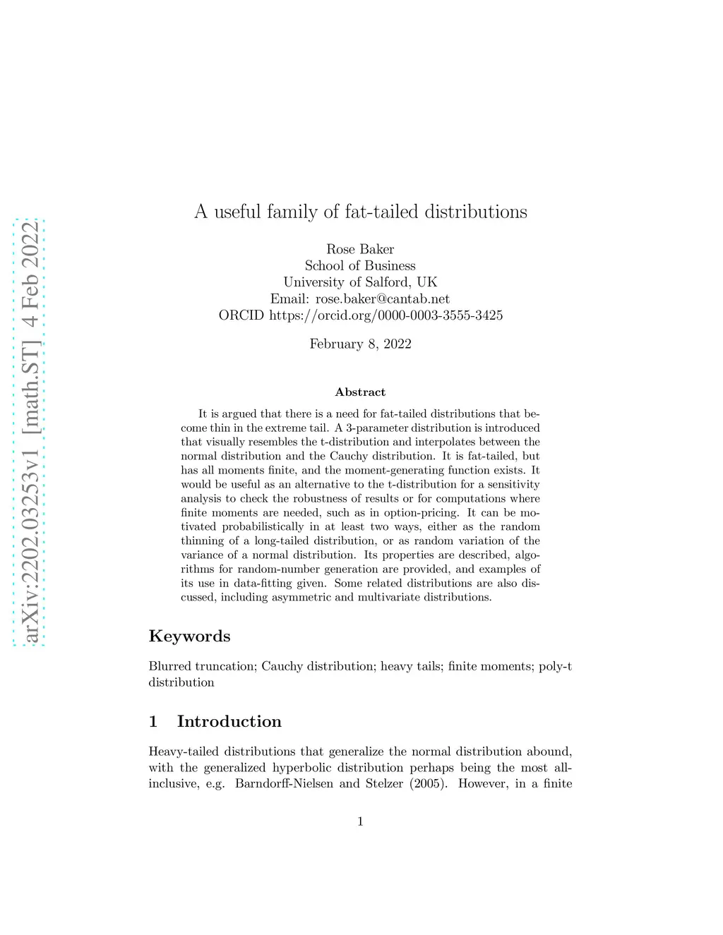 It is argued that there is a need for fat-tailed distributions that become thin in the extreme tail. A 3-parameter distribution is introduced that visually resembles the t-distribution and interpolates between the normal distribution and the Cauchy distribution. It is fat-tailed, but has all moments finite, and the moment-generating function exists. It would be useful as an alternative to the t-distribution for a sensitivity analysis to check the robustness of results or for computations where finite moments are needed, such as in option-pricing. It can be motivated probabilistically in at least two ways, either as the random thinning of a long-tailed distribution, or as random variation of the variance of a normal distribution. Its properties are described, algorithms for random-number generation are provided, and examples of its use in data-fitting given. Some related distributions are also discussed, including asymmetric and multivariate distributions.