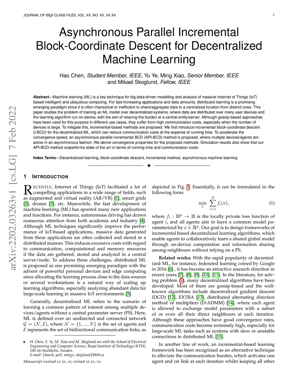 Machine learning (ML) is a key technique for big-data-driven modelling and analysis of massive Internet of Things (IoT) based intelligent and ubiquitous computing. For fast-increasing applications and data amounts, distributed learning is a promising emerging paradigm since it is often impractical or inefficient to share/aggregate data to a centralized location from distinct ones. This paper studies the problem of training an ML model over decentralized systems, where data are distributed over many user devices and the learning algorithm run on-device, with the aim of relaxing the burden at a central entity/server. Although gossip-based approaches have been used for this purpose in different use cases, they suffer from high communication costs, especially when the number of devices is large. To mitigate this, incremental-based methods are proposed. We first introduce incremental block-coordinate descent (I-BCD) for the decentralized ML, which can reduce communication costs at the expense of running time. To accelerate the convergence speed, an asynchronous parallel incremental BCD (API-BCD) method is proposed, where multiple devices/agents are active in an asynchronous fashion. We derive convergence properties for the proposed methods. Simulation results also show that our API-BCD method outperforms state of the art in terms of running time and communication costs.