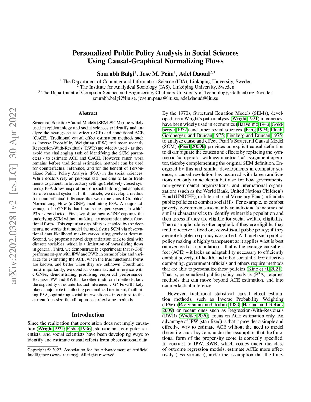 Structural Equation/Causal Models (SEMs/SCMs) are widely used in epidemiology and social sciences to identify and analyze the average causal effect (ACE) and conditional ACE (CACE). Traditional causal effect estimation methods such as Inverse Probability Weighting (IPW) and more recently Regression-With-Residuals (RWR) are widely used - as they avoid the challenging task of identifying the SCM parameters - to estimate ACE and CACE. However, much work remains before traditional estimation methods can be used for counterfactual inference, and for the benefit of Personalized Public Policy Analysis (PA) in the social sciences. While doctors rely on personalized medicine to tailor treatments to patients in laboratory settings (relatively closed systems), PA draws inspiration from such tailoring but adapts it for open social systems. In this article, we develop a method for counterfactual inference that we name causal-Graphical Normalizing Flow (c-GNF), facilitating PA. First, we show how c-GNF captures the underlying SCM without making any assumption about functional forms. Second, we propose a novel dequantization trick to deal with discrete variables, which is a limitation of normalizing flows in general. Third, we demonstrate in experiments that c-GNF performs on-par with IPW and RWR in terms of bias and variance for estimating the ATE, when the true functional forms are known, and better when they are unknown. Fourth and most importantly, we conduct counterfactual inference with c-GNFs, demonstrating promising empirical performance. Because IPW and RWR, like other traditional methods, lack the capability of counterfactual inference, c-GNFs will likely play a major role in tailoring personalized treatment, facilitating PA, optimizing social interventions - in contrast to the current `one-size-fits-all' approach of existing methods.