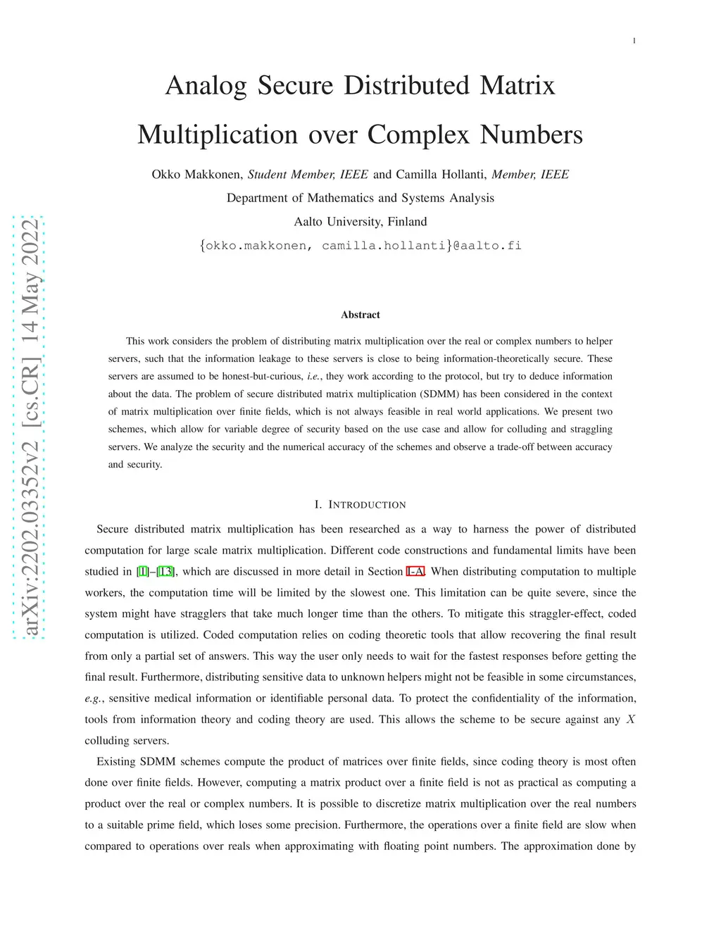 This work considers the problem of distributing matrix multiplication over the real or complex numbers to helper servers, such that the information leakage to these servers is close to being information-theoretically secure. These servers are assumed to be honest-but-curious, i.e., they work according to the protocol, but try to deduce information about the data. The problem of secure distributed matrix multiplication (SDMM) has been considered in the context of matrix multiplication over finite fields, which is not always feasible in real world applications. We present two schemes, which allow for variable degree of security based on the use case and allow for colluding and straggling servers. We analyze the security and the numerical accuracy of the schemes and observe a trade-off between accuracy and security.