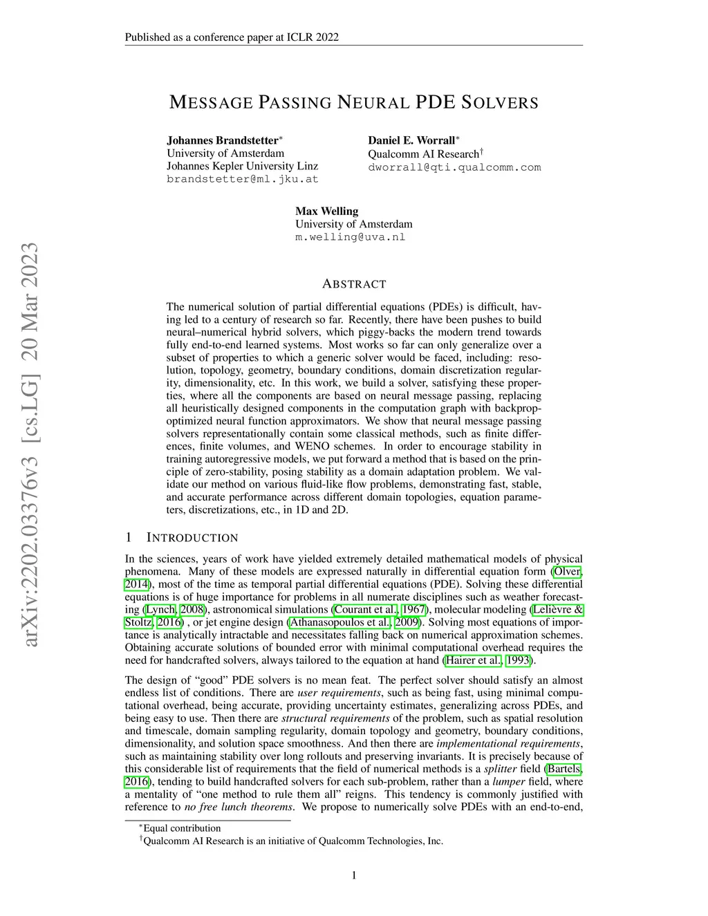 The numerical solution of partial differential equations (PDEs) is difficult, having led to a century of research so far. Recently, there have been pushes to build neural--numerical hybrid solvers, which piggy-backs the modern trend towards fully end-to-end learned systems. Most works so far can only generalize over a subset of properties to which a generic solver would be faced, including: resolution, topology, geometry, boundary conditions, domain discretization regularity, dimensionality, etc. In this work, we build a solver, satisfying these properties, where all the components are based on neural message passing, replacing all heuristically designed components in the computation graph with backprop-optimized neural function approximators. We show that neural message passing solvers representationally contain some classical methods, such as finite differences, finite volumes, and WENO schemes. In order to encourage stability in training autoregressive models, we put forward a method that is based on the principle of zero-stability, posing stability as a domain adaptation problem. We validate our method on various fluid-like flow problems, demonstrating fast, stable, and accurate performance across different domain topologies, equation parameters, discretizations, etc., in 1D and 2D.