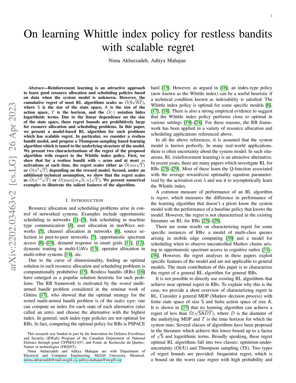 Reinforcement learning is an attractive approach to learn good resource allocation and scheduling policies based on data when the system model is unknown. However, the cumulative regret of most RL algorithms scales as , where is the size of the state space, is the size of the action space, is the horizon, and the notation hides logarithmic terms. Due to the linear dependence on the size of the state space, these regret bounds are prohibitively large for resource allocation and scheduling problems. In this paper, we present a model-based RL algorithm for such problems which has scalable regret. In particular, we consider a restless bandit model, and propose a Thompson-sampling based learning algorithm which is tuned to the underlying structure of the model. We present two characterizations of the regret of the proposed algorithm with respect to the Whittle index policy. First, we show that for a restless bandit with arms and at most activations at each time, the regret scales either as or depending on the reward model. Second, under an additional technical assumption, we show that the regret scales as or . We present numerical examples to illustrate the salient features of the algorithm.
