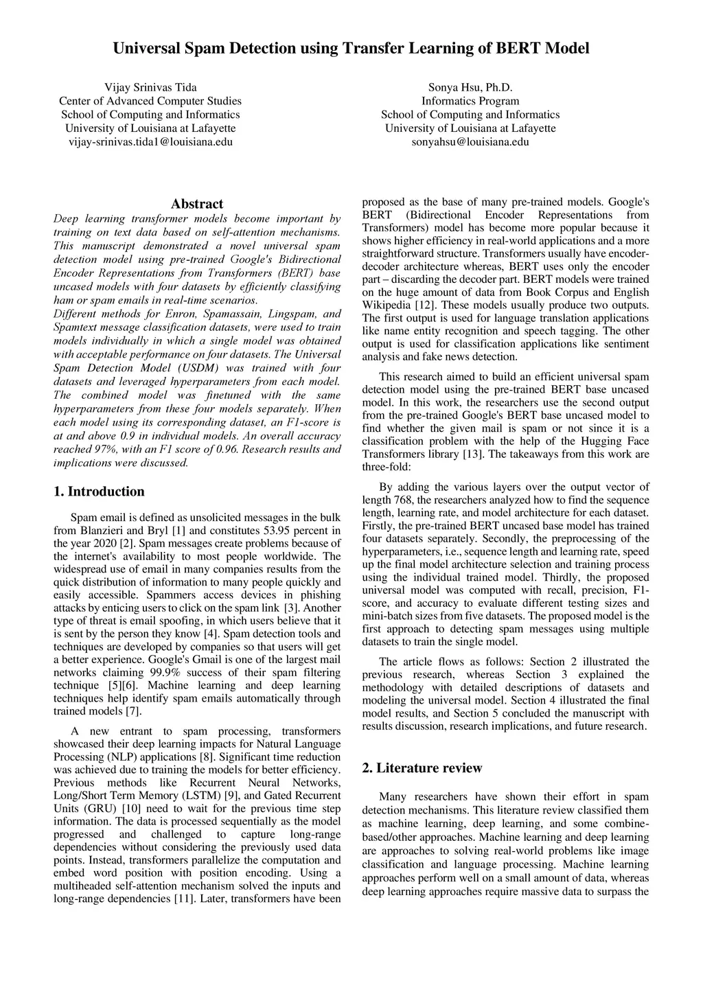 Deep learning transformer models become important by training on text data based on self-attention mechanisms. This manuscript demonstrated a novel universal spam detection model using pre-trained Google's Bidirectional Encoder Representations from Transformers (BERT) base uncased models with four datasets by efficiently classifying ham or spam emails in real-time scenarios. Different methods for Enron, Spamassain, Lingspam, and Spamtext message classification datasets, were used to train models individually in which a single model was obtained with acceptable performance on four datasets. The Universal Spam Detection Model (USDM) was trained with four datasets and leveraged hyperparameters from each model. The combined model was finetuned with the same hyperparameters from these four models separately. When each model using its corresponding dataset, an F1-score is at and above 0.9 in individual models. An overall accuracy reached 97%, with an F1 score of 0.96. Research results and implications were discussed.