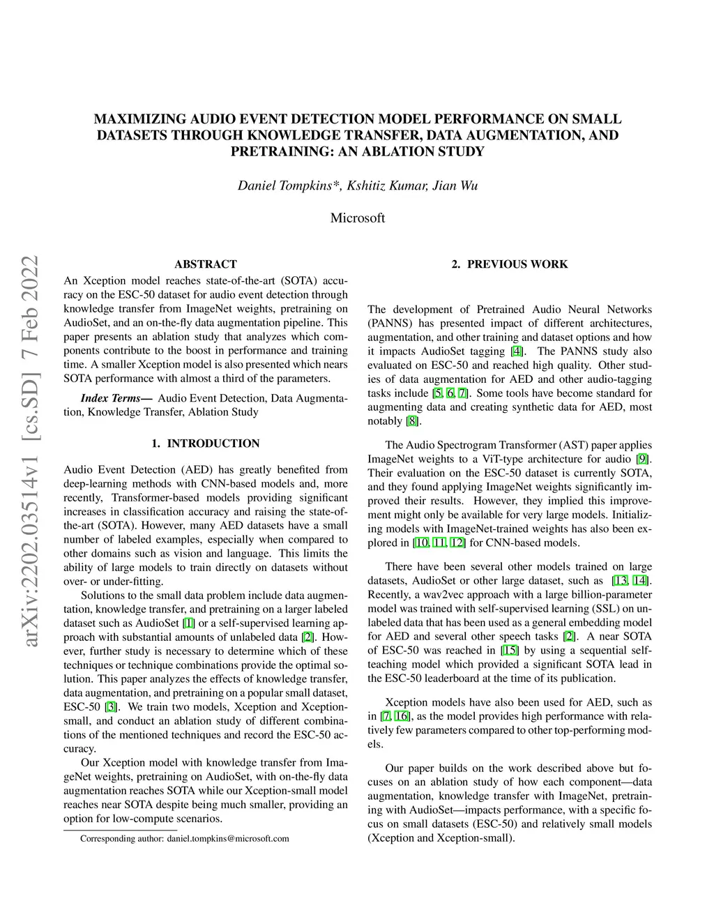 An Xception model reaches state-of-the-art (SOTA) accuracy on the ESC-50 dataset for audio event detection through knowledge transfer from ImageNet weights, pretraining on AudioSet, and an on-the-fly data augmentation pipeline. This paper presents an ablation study that analyzes which components contribute to the boost in performance and training time. A smaller Xception model is also presented which nears SOTA performance with almost a third of the parameters.