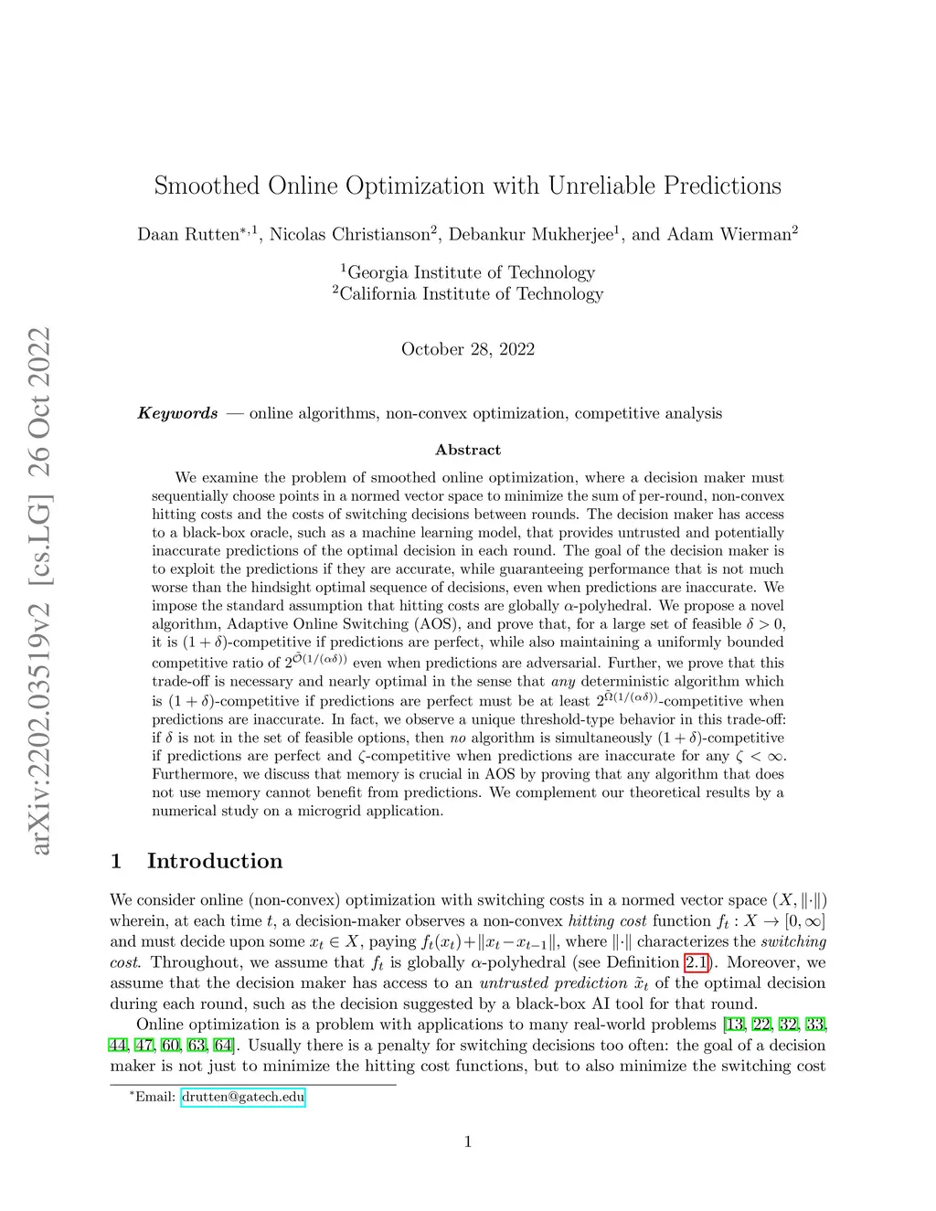 We examine the problem of smoothed online optimization, where a decision maker must sequentially choose points in a normed vector space to minimize the sum of per-round, non-convex hitting costs and the costs of switching decisions between rounds. The decision maker has access to a black-box oracle, such as a machine learning model, that provides untrusted and potentially inaccurate predictions of the optimal decision in each round. The goal of the decision maker is to exploit the predictions if they are accurate, while guaranteeing performance that is not much worse than the hindsight optimal sequence of decisions, even when predictions are inaccurate. We impose the standard assumption that hitting costs are globally -polyhedral. We propose a novel algorithm, Adaptive Online Switching (AOS), and prove that, for a large set of feasible , it is -competitive if predictions are perfect, while also maintaining a uniformly bounded competitive ratio of even when predictions are adversarial. Further, we prove that this trade-off is necessary and nearly optimal in the sense that \emph{any} deterministic algorithm which is -competitive if predictions are perfect must be at least -competitive when predictions are inaccurate. In fact, we observe a unique threshold-type behavior in this trade-off: if is not in the set of feasible options, then \emph{no} algorithm is simultaneously -competitive if predictions are perfect and -competitive when predictions are inaccurate for any . Furthermore, we discuss that memory is crucial in AOS by proving that any algorithm that does not use memory cannot benefit from predictions. We complement our theoretical results by a numerical study on a microgrid application.