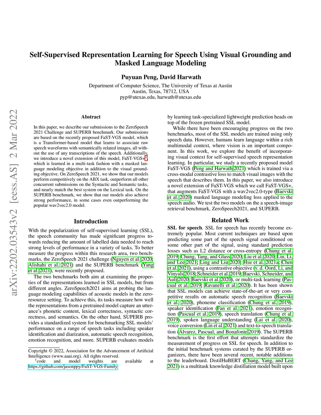In this paper, we describe our submissions to the ZeroSpeech 2021 Challenge and SUPERB benchmark. Our submissions are based on the recently proposed FaST-VGS model, which is a Transformer-based model that learns to associate raw speech waveforms with semantically related images, all without the use of any transcriptions of the speech. Additionally, we introduce a novel extension of this model, FaST-VGS+, which is learned in a multi-task fashion with a masked language modeling objective in addition to the visual grounding objective. On ZeroSpeech 2021, we show that our models perform competitively on the ABX task, outperform all other concurrent submissions on the Syntactic and Semantic tasks, and nearly match the best system on the Lexical task. On the SUPERB benchmark, we show that our models also achieve strong performance, in some cases even outperforming the popular wav2vec2.0 model.