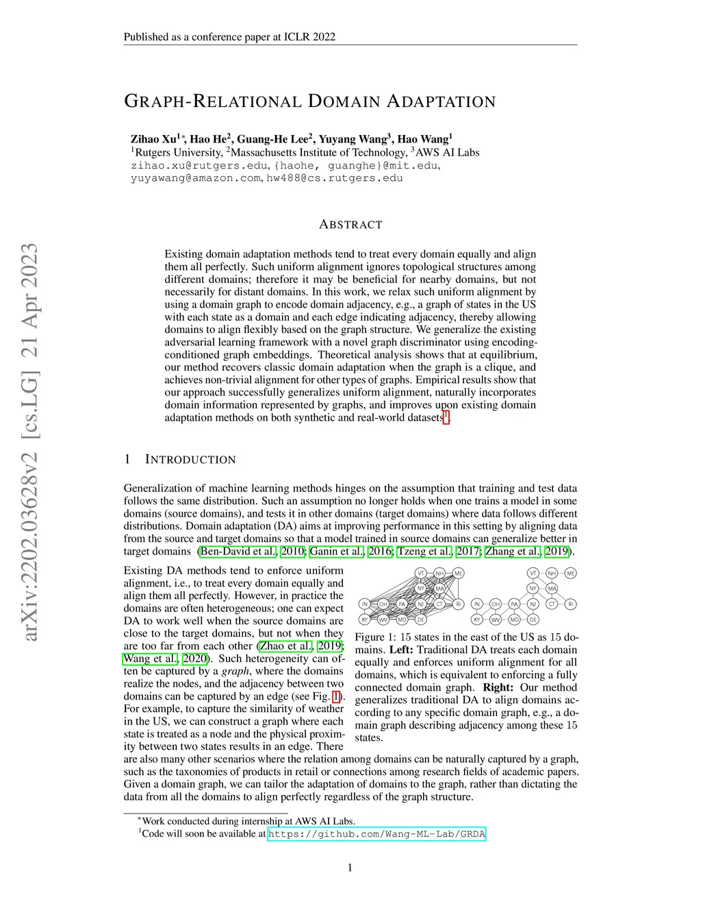 Existing domain adaptation methods tend to treat every domain equally and align them all perfectly. Such uniform alignment ignores topological structures among different domains; therefore it may be beneficial for nearby domains, but not necessarily for distant domains. In this work, we relax such uniform alignment by using a domain graph to encode domain adjacency, e.g., a graph of states in the US with each state as a domain and each edge indicating adjacency, thereby allowing domains to align flexibly based on the graph structure. We generalize the existing adversarial learning framework with a novel graph discriminator using encoding-conditioned graph embeddings. Theoretical analysis shows that at equilibrium, our method recovers classic domain adaptation when the graph is a clique, and achieves non-trivial alignment for other types of graphs. Empirical results show that our approach successfully generalizes uniform alignment, naturally incorporates domain information represented by graphs, and improves upon existing domain adaptation methods on both synthetic and real-world datasets. Code will soon be available at https://github.com/Wang-ML-Lab/GRDA.