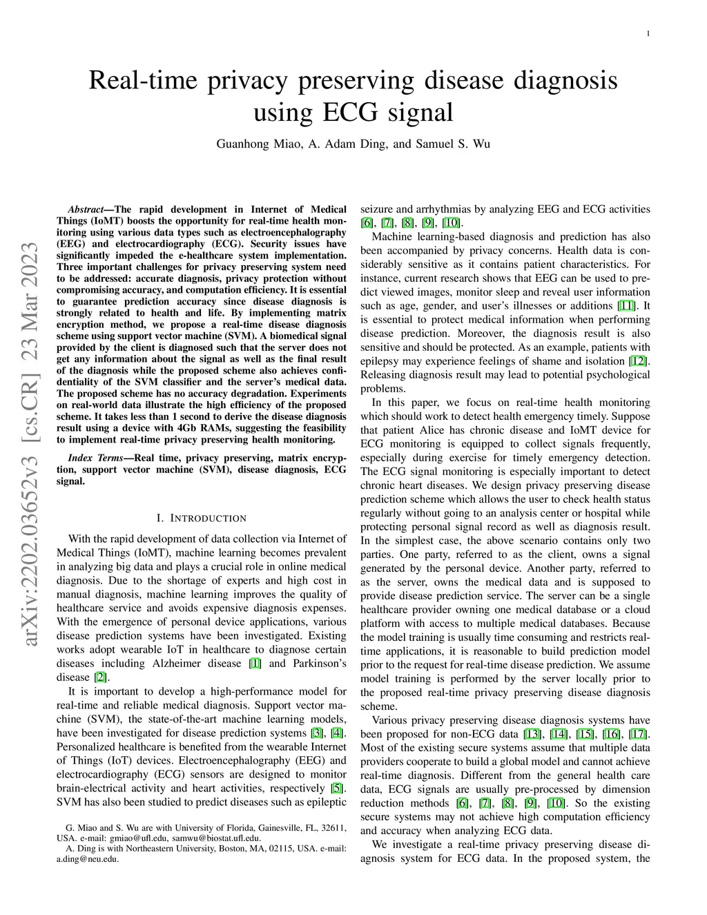 The rapid development in Internet of Medical Things (IoMT) boosts the opportunity for real-time health monitoring using various data types such as electroencephalography (EEG) and electrocardiography (ECG). Security issues have significantly impeded the e-healthcare system implementation. Three important challenges for privacy preserving system need to be addressed: accurate diagnosis, privacy protection without compromising accuracy, and computation efficiency. It is essential to guarantee prediction accuracy since disease diagnosis is strongly related to health and life. By implementing matrix encryption method, we propose a real-time disease diagnosis scheme using support vector machine (SVM). A biomedical signal provided by the client is diagnosed such that the server does not get any information about the signal as well as the final result of the diagnosis while the proposed scheme also achieves confidentiality of the SVM classifier and the server's medical data. The proposed scheme has no accuracy degradation. Experiments on real-world data illustrate the high efficiency of the proposed scheme. It takes less than 1 second to derive the disease diagnosis result using a device with 4Gb RAMs, suggesting the feasibility to implement real-time privacy preserving health monitoring.