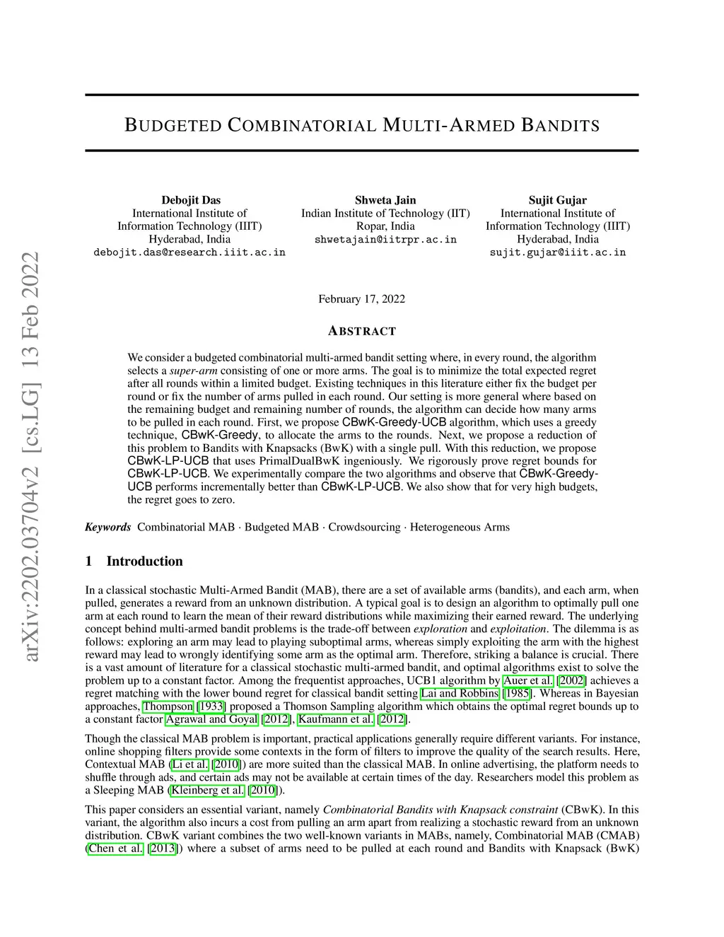 We consider a budgeted combinatorial multi-armed bandit setting where, in every round, the algorithm selects a super-arm consisting of one or more arms. The goal is to minimize the total expected regret after all rounds within a limited budget. Existing techniques in this literature either fix the budget per round or fix the number of arms pulled in each round. Our setting is more general where based on the remaining budget and remaining number of rounds, the algorithm can decide how many arms to be pulled in each round. First, we propose CBwK-Greedy-UCB algorithm, which uses a greedy technique, CBwK-Greedy, to allocate the arms to the rounds. Next, we propose a reduction of this problem to Bandits with Knapsacks (BwK) with a single pull. With this reduction, we propose CBwK-LPUCB that uses PrimalDualBwK ingeniously. We rigorously prove regret bounds for CBwK-LP-UCB. We experimentally compare the two algorithms and observe that CBwK-Greedy-UCB performs incrementally better than CBwK-LP-UCB. We also show that for very high budgets, the regret goes to zero.