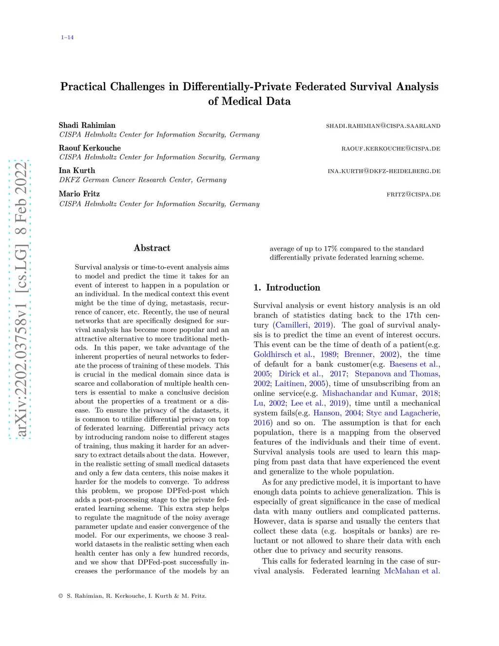 Survival analysis or time-to-event analysis aims to model and predict the time it takes for an event of interest to happen in a population or an individual. In the medical context this event might be the time of dying, metastasis, recurrence of cancer, etc. Recently, the use of neural networks that are specifically designed for survival analysis has become more popular and an attractive alternative to more traditional methods. In this paper, we take advantage of the inherent properties of neural networks to federate the process of training of these models. This is crucial in the medical domain since data is scarce and collaboration of multiple health centers is essential to make a conclusive decision about the properties of a treatment or a disease. To ensure the privacy of the datasets, it is common to utilize differential privacy on top of federated learning. Differential privacy acts by introducing random noise to different stages of training, thus making it harder for an adversary to extract details about the data. However, in the realistic setting of small medical datasets and only a few data centers, this noise makes it harder for the models to converge. To address this problem, we propose DPFed-post which adds a post-processing stage to the private federated learning scheme. This extra step helps to regulate the magnitude of the noisy average parameter update and easier convergence of the model. For our experiments, we choose 3 real-world datasets in the realistic setting when each health center has only a few hundred records, and we show that DPFed-post successfully increases the performance of the models by an average of up to compared to the standard differentially private federated learning scheme.