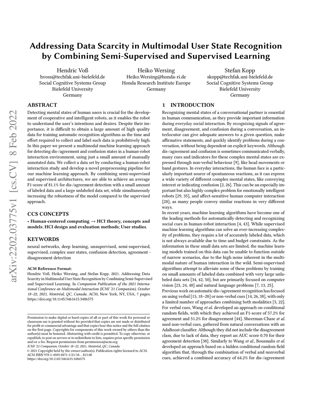 Detecting mental states of human users is crucial for the development of cooperative and intelligent robots, as it enables the robot to understand the user's intentions and desires. Despite their importance, it is difficult to obtain a large amount of high quality data for training automatic recognition algorithms as the time and effort required to collect and label such data is prohibitively high. In this paper we present a multimodal machine learning approach for detecting dis-/agreement and confusion states in a human-robot interaction environment, using just a small amount of manually annotated data. We collect a data set by conducting a human-robot interaction study and develop a novel preprocessing pipeline for our machine learning approach. By combining semi-supervised and supervised architectures, we are able to achieve an average F1-score of 81.1\% for dis-/agreement detection with a small amount of labeled data and a large unlabeled data set, while simultaneously increasing the robustness of the model compared to the supervised approach.