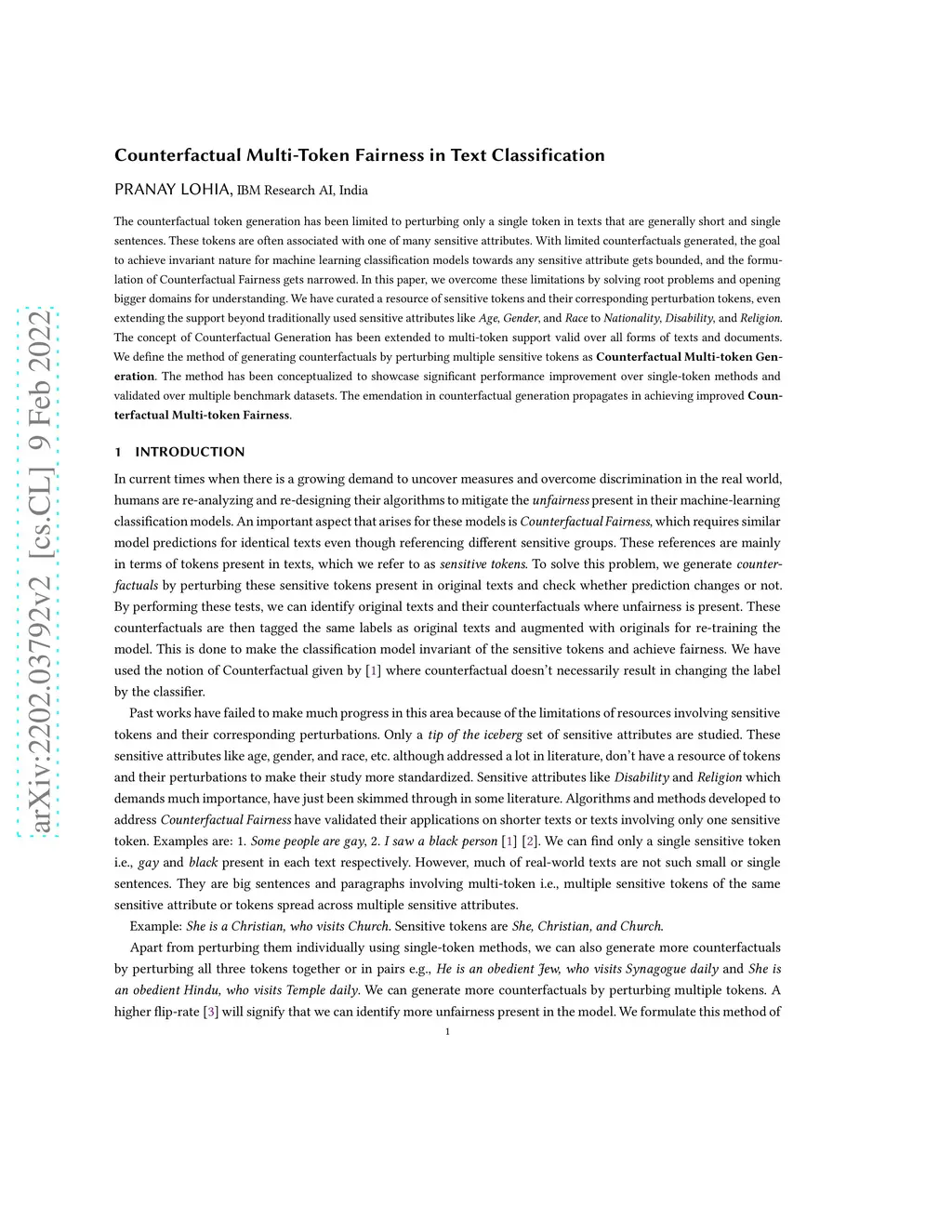 The counterfactual token generation has been limited to perturbing only a single token in texts that are generally short and single sentences. These tokens are often associated with one of many sensitive attributes. With limited counterfactuals generated, the goal to achieve invariant nature for machine learning classification models towards any sensitive attribute gets bounded, and the formulation of Counterfactual Fairness gets narrowed. In this paper, we overcome these limitations by solving root problems and opening bigger domains for understanding. We have curated a resource of sensitive tokens and their corresponding perturbation tokens, even extending the support beyond traditionally used sensitive attributes like Age, Gender, Race to Nationality, Disability, and Religion. The concept of Counterfactual Generation has been extended to multi-token support valid over all forms of texts and documents. We define the method of generating counterfactuals by perturbing multiple sensitive tokens as Counterfactual Multi-token Generation. The method has been conceptualized to showcase significant performance improvement over single-token methods and validated over multiple benchmark datasets. The emendation in counterfactual generation propagates in achieving improved Counterfactual Multi-token Fairness.