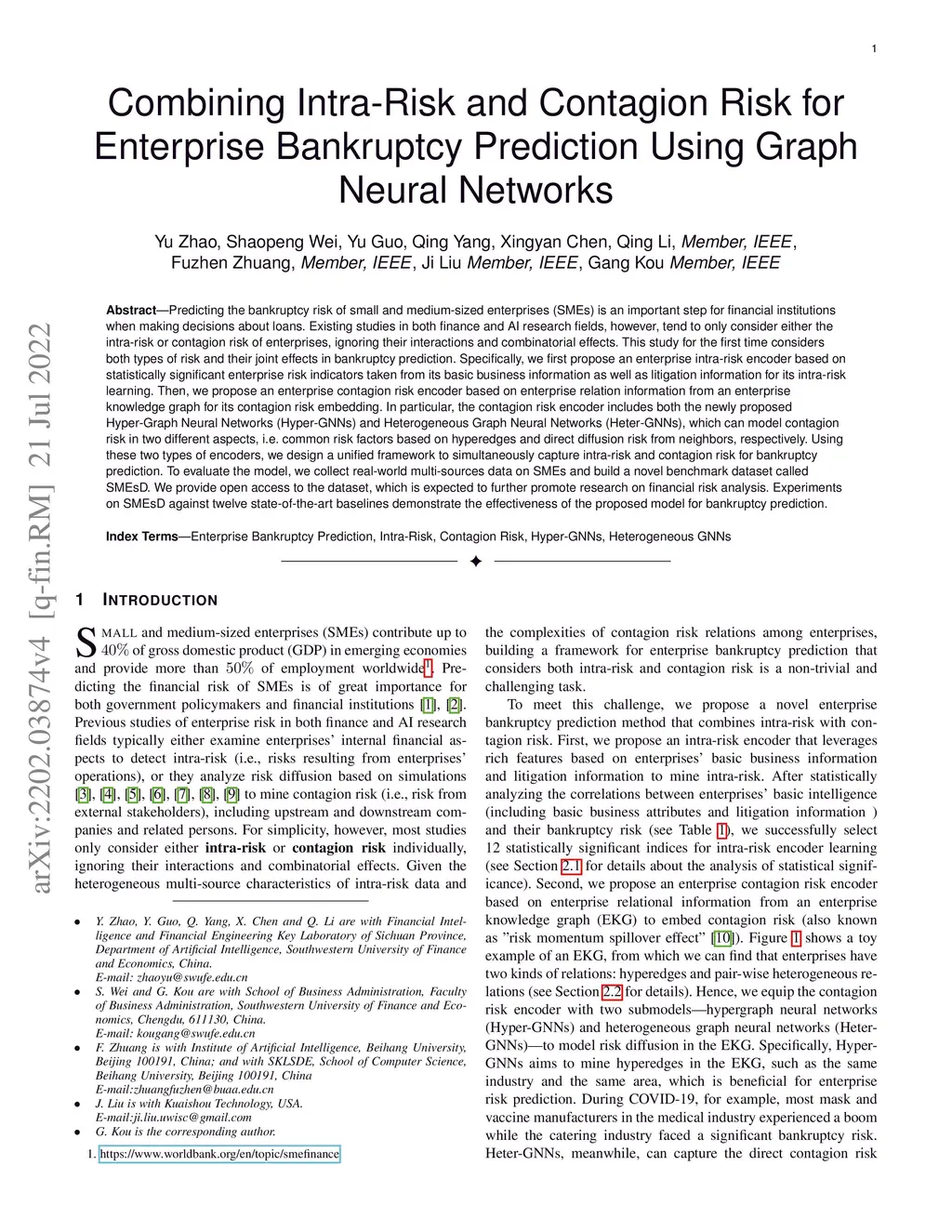 Predicting the bankruptcy risk of small and medium-sized enterprises (SMEs) is an important step for financial institutions when making decisions about loans. Existing studies in both finance and AI research fields, however, tend to only consider either the intra-risk or contagion risk of enterprises, ignoring their interactions and combinatorial effects. This study for the first time considers both types of risk and their joint effects in bankruptcy prediction. Specifically, we first propose an enterprise intra-risk encoder based on statistically significant enterprise risk indicators for its intra-risk learning. Then, we propose an enterprise contagion risk encoder based on enterprise relation information from an enterprise knowledge graph for its contagion risk embedding. In particular, the contagion risk encoder includes both the newly proposed Hyper-Graph Neural Networks and Heterogeneous Graph Neural Networks, which can model contagion risk in two different aspects, i.e. common risk factors based on hyperedges and direct diffusion risk from neighbors, respectively. To evaluate the model, we collect real-world multi-sources data on SMEs and build a novel benchmark dataset called SMEsD. We provide open access to the dataset, which is expected to further promote research on financial risk analysis. Experiments on SMEsD against twelve state-of-the-art baselines demonstrate the effectiveness of the proposed model for bankruptcy prediction.