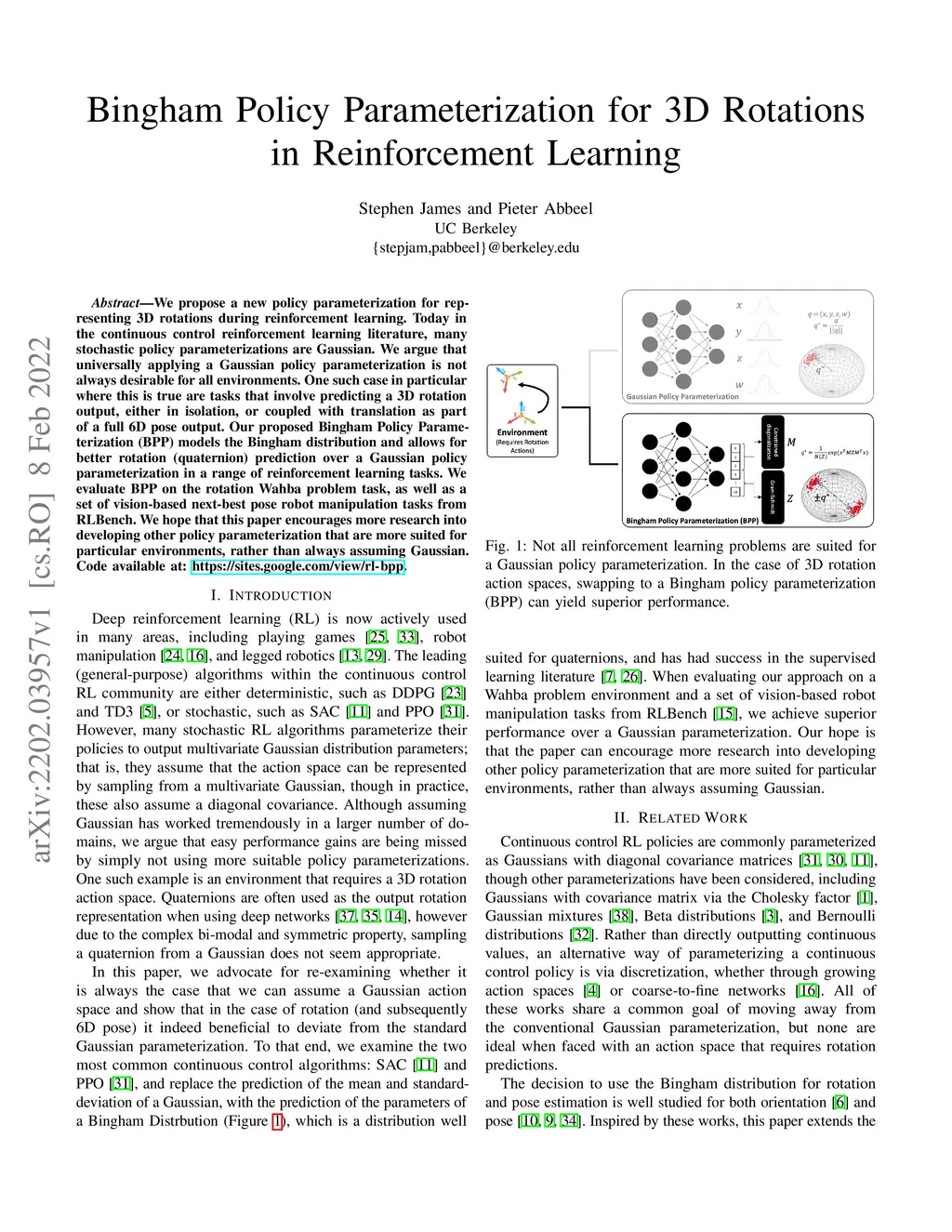 We propose a new policy parameterization for representing 3D rotations during reinforcement learning. Today in the continuous control reinforcement learning literature, many stochastic policy parameterizations are Gaussian. We argue that universally applying a Gaussian policy parameterization is not always desirable for all environments. One such case in particular where this is true are tasks that involve predicting a 3D rotation output, either in isolation, or coupled with translation as part of a full 6D pose output. Our proposed Bingham Policy Parameterization (BPP) models the Bingham distribution and allows for better rotation (quaternion) prediction over a Gaussian policy parameterization in a range of reinforcement learning tasks. We evaluate BPP on the rotation Wahba problem task, as well as a set of vision-based next-best pose robot manipulation tasks from RLBench. We hope that this paper encourages more research into developing other policy parameterization that are more suited for particular environments, rather than always assuming Gaussian.