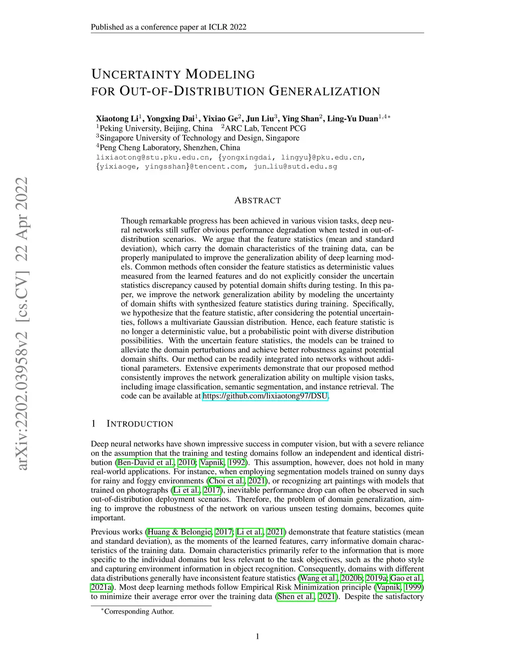 Though remarkable progress has been achieved in various vision tasks, deep neural networks still suffer obvious performance degradation when tested in out-of-distribution scenarios. We argue that the feature statistics (mean and standard deviation), which carry the domain characteristics of the training data, can be properly manipulated to improve the generalization ability of deep learning models. Common methods often consider the feature statistics as deterministic values measured from the learned features and do not explicitly consider the uncertain statistics discrepancy caused by potential domain shifts during testing. In this paper, we improve the network generalization ability by modeling the uncertainty of domain shifts with synthesized feature statistics during training. Specifically, we hypothesize that the feature statistic, after considering the potential uncertainties, follows a multivariate Gaussian distribution. Hence, each feature statistic is no longer a deterministic value, but a probabilistic point with diverse distribution possibilities. With the uncertain feature statistics, the models can be trained to alleviate the domain perturbations and achieve better robustness against potential domain shifts. Our method can be readily integrated into networks without additional parameters. Extensive experiments demonstrate that our proposed method consistently improves the network generalization ability on multiple vision tasks, including image classification, semantic segmentation, and instance retrieval. The code can be available at https://github.com/lixiaotong97/DSU.