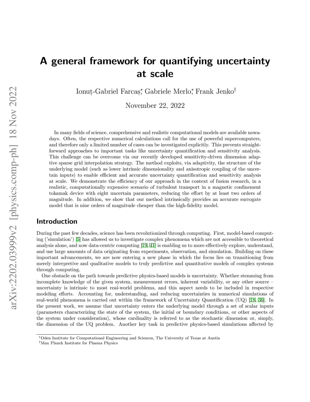 In many fields of science, comprehensive and realistic computational models are available nowadays. Often, the respective numerical calculations call for the use of powerful supercomputers, and therefore only a limited number of cases can be investigated explicitly. This prevents straightforward approaches to important tasks like uncertainty quantification and sensitivity analysis. This challenge can be overcome via our recently developed sensitivity-driven dimension adaptive sparse grid interpolation strategy. The method exploits, via adaptivity, the structure of the underlying model (such as lower intrinsic dimensionality and anisotropic coupling of the uncertain inputs) to enable efficient and accurate uncertainty quantification and sensitivity analysis at scale. We demonstrate the efficiency of our approach in the context of fusion research, in a realistic, computationally expensive scenario of turbulent transport in a magnetic confinement tokamak device with eight uncertain parameters, reducing the effort by at least two orders of magnitude. In addition, we show that our method intrinsically provides an accurate surrogate model that is nine orders of magnitude cheaper than the high-fidelity model.