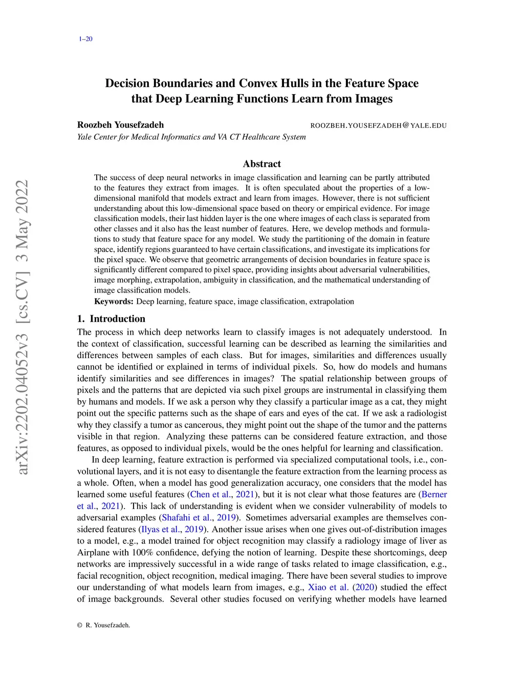 Decision boundaries and convex hulls in the feature space that deep learning functions learn from images