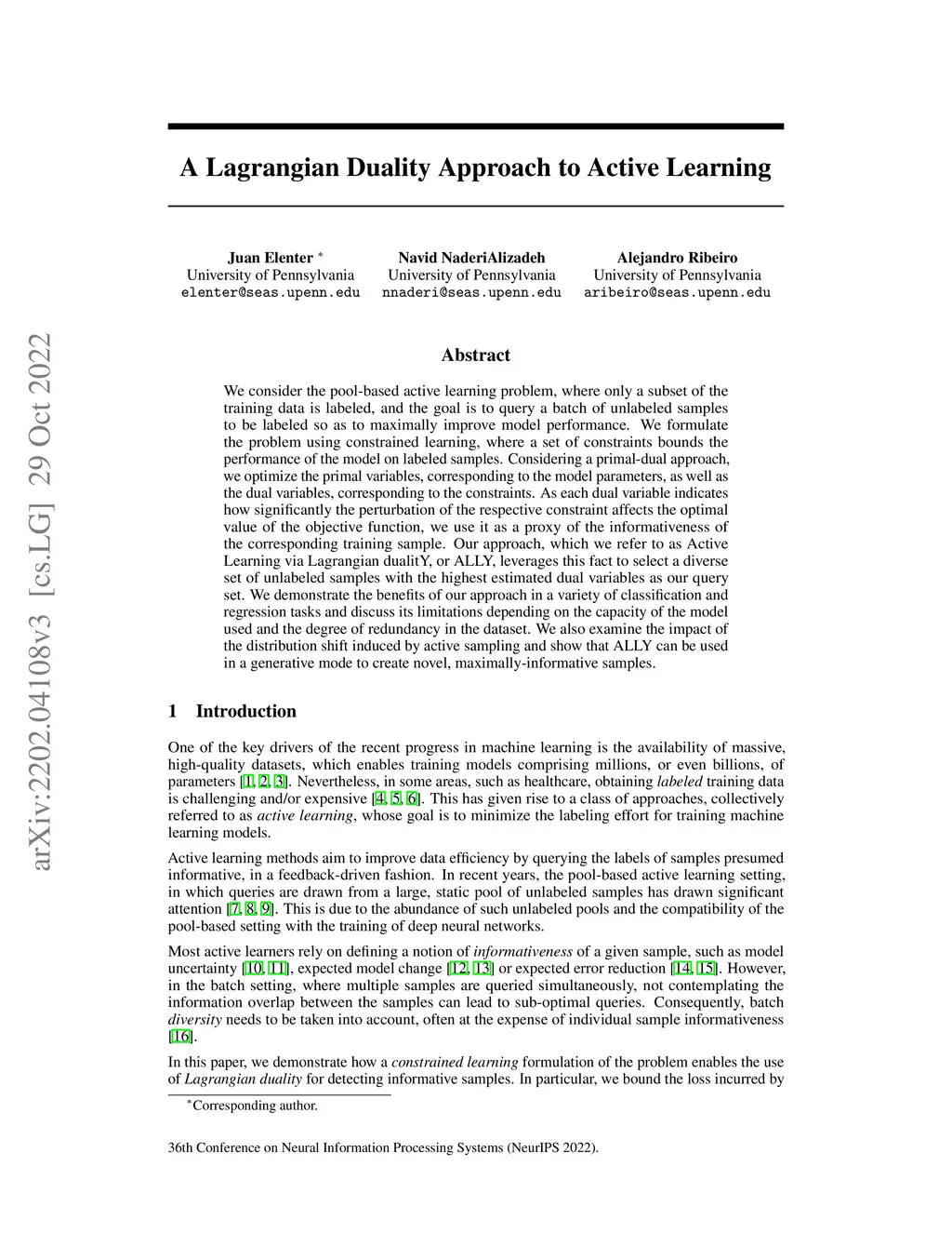 We consider the pool-based active learning problem, where only a subset of the training data is labeled, and the goal is to query a batch of unlabeled samples to be labeled so as to maximally improve model performance. We formulate the problem using constrained learning, where a set of constraints bounds the performance of the model on labeled samples. Considering a primal-dual approach, we optimize the primal variables, corresponding to the model parameters, as well as the dual variables, corresponding to the constraints. As each dual variable indicates how significantly the perturbation of the respective constraint affects the optimal value of the objective function, we use it as a proxy of the informativeness of the corresponding training sample. Our approach, which we refer to as Active Learning via Lagrangian dualitY, or ALLY, leverages this fact to select a diverse set of unlabeled samples with the highest estimated dual variables as our query set. We demonstrate the benefits of our approach in a variety of classification and regression tasks and discuss its limitations depending on the capacity of the model used and the degree of redundancy in the dataset. We also examine the impact of the distribution shift induced by active sampling and show that ALLY can be used in a generative mode to create novel, maximally-informative samples.