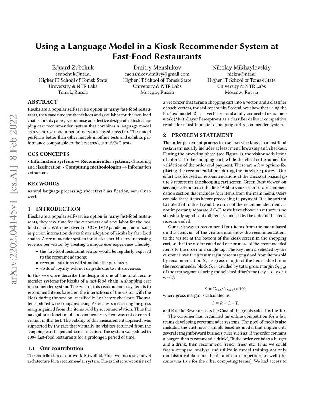 Using a Language Model in a Kiosk Recommender System at Fast-Food