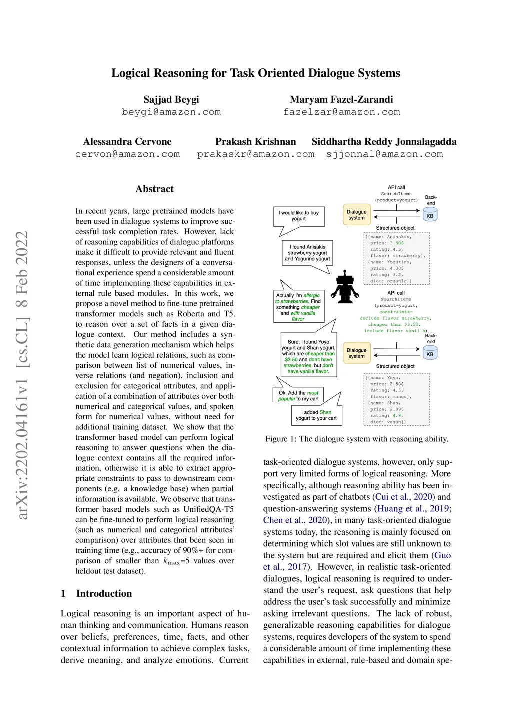 In recent years, large pretrained models have been used in dialogue systems to improve successful task completion rates. However, lack of reasoning capabilities of dialogue platforms make it difficult to provide relevant and fluent responses, unless the designers of a conversational experience spend a considerable amount of time implementing these capabilities in external rule based modules. In this work, we propose a novel method to fine-tune pretrained transformer models such as Roberta and T5. to reason over a set of facts in a given dialogue context. Our method includes a synthetic data generation mechanism which helps the model learn logical relations, such as comparison between list of numerical values, inverse relations (and negation), inclusion and exclusion for categorical attributes, and application of a combination of attributes over both numerical and categorical values, and spoken form for numerical values, without need for additional training dataset. We show that the transformer based model can perform logical reasoning to answer questions when the dialogue context contains all the required information, otherwise it is able to extract appropriate constraints to pass to downstream components (e.g. a knowledge base) when partial information is available. We observe that transformer based models such as UnifiedQA-T5 can be fine-tuned to perform logical reasoning (such as numerical and categorical attributes' comparison) over attributes that been seen in training time (e.g., accuracy of 90\%+ for comparison of smaller than =5 values over heldout test dataset).