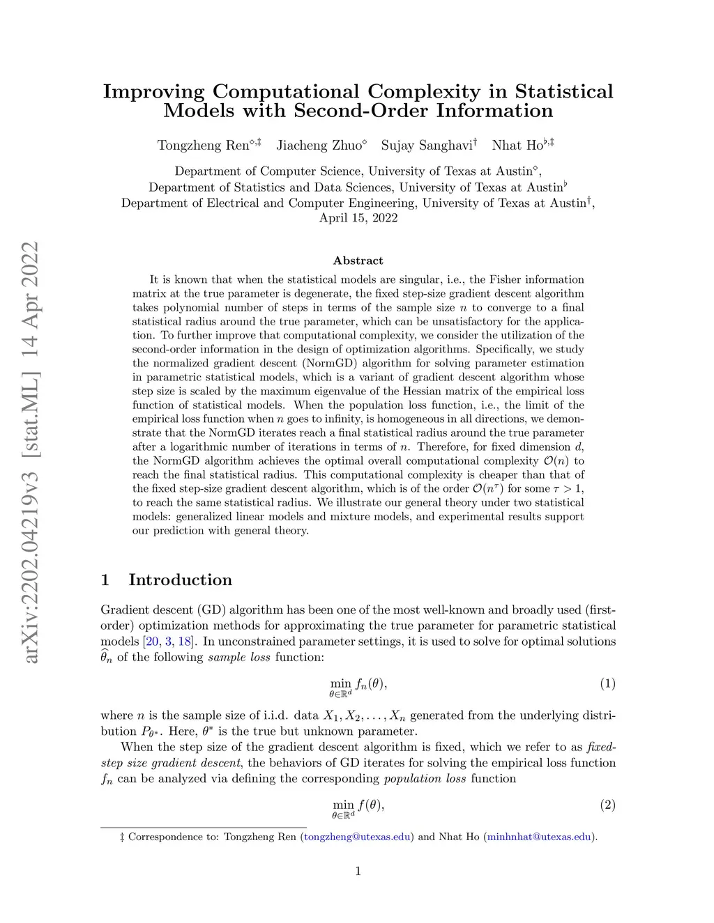 It is known that when the statistical models are singular, i.e., the Fisher information matrix at the true parameter is degenerate, the fixed step-size gradient descent algorithm takes polynomial number of steps in terms of the sample size to converge to a final statistical radius around the true parameter, which can be unsatisfactory for the application. To further improve that computational complexity, we consider the utilization of the second-order information in the design of optimization algorithms. Specifically, we study the normalized gradient descent (NormGD) algorithm for solving parameter estimation in parametric statistical models, which is a variant of gradient descent algorithm whose step size is scaled by the maximum eigenvalue of the Hessian matrix of the empirical loss function of statistical models. When the population loss function, i.e., the limit of the empirical loss function when goes to infinity, is homogeneous in all directions, we demonstrate that the NormGD iterates reach a final statistical radius around the true parameter after a logarithmic number of iterations in terms of . Therefore, for fixed dimension , the NormGD algorithm achieves the optimal overall computational complexity to reach the final statistical radius. This computational complexity is cheaper than that of the fixed step-size gradient descent algorithm, which is of the order for some , to reach the same statistical radius. We illustrate our general theory under two statistical models: generalized linear models and mixture models, and experimental results support our prediction with general theory.