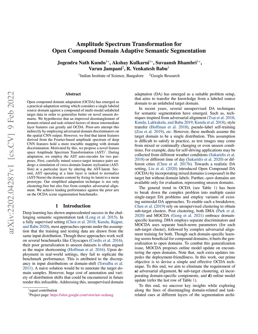 Open compound domain adaptation (OCDA) has emerged as a practical adaptation setting which considers a single labeled source domain against a compound of multi-modal unlabeled target data in order to generalize better on novel unseen domains. We hypothesize that an improved disentanglement of domain-related and task-related factors of dense intermediate layer features can greatly aid OCDA. Prior-arts attempt this indirectly by employing adversarial domain discriminators on the spatial CNN output. However, we find that latent features derived from the Fourier-based amplitude spectrum of deep CNN features hold a more tractable mapping with domain discrimination. Motivated by this, we propose a novel feature space Amplitude Spectrum Transformation (AST). During adaptation, we employ the AST auto-encoder for two purposes. First, carefully mined source-target instance pairs undergo a simulation of cross-domain feature stylization (AST-Sim) at a particular layer by altering the AST-latent. Second, AST operating at a later layer is tasked to normalize (AST-Norm) the domain content by fixing its latent to a mean prototype. Our simplified adaptation technique is not only clustering-free but also free from complex adversarial alignment. We achieve leading performance against the prior arts on the OCDA scene segmentation benchmarks.