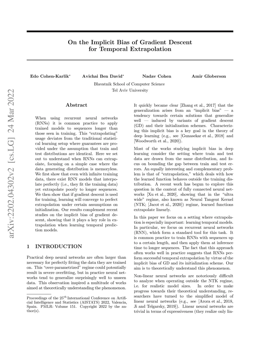 When using recurrent neural networks (RNNs) it is common practice to apply trained models to sequences longer than those seen in training. This "extrapolating" usage deviates from the traditional statistical learning setup where guarantees are provided under the assumption that train and test distributions are identical. Here we set out to understand when RNNs can extrapolate, focusing on a simple case where the data generating distribution is memoryless. We first show that even with infinite training data, there exist RNN models that interpolate perfectly (i.e., they fit the training data) yet extrapolate poorly to longer sequences. We then show that if gradient descent is used for training, learning will converge to perfect extrapolation under certain assumptions on initialization. Our results complement recent studies on the implicit bias of gradient descent, showing that it plays a key role in extrapolation when learning temporal prediction models.
