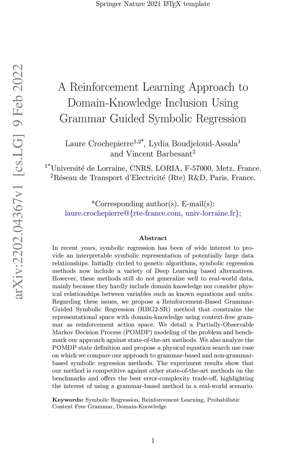 In recent years, symbolic regression has been of wide interest to provide an interpretable symbolic representation of potentially large data relationships. Initially circled to genetic algorithms, symbolic regression methods now include a variety of Deep Learning based alternatives. However, these methods still do not generalize well to real-world data, mainly because they hardly include domain knowledge nor consider physical relationships between variables such as known equations and units. Regarding these issues, we propose a Reinforcement-Based Grammar-Guided Symbolic Regression (RBG2-SR) method that constrains the representational space with domain-knowledge using context-free grammar as reinforcement action space. We detail a Partially-Observable Markov Decision Process (POMDP) modeling of the problem and benchmark our approach against state-of-the-art methods. We also analyze the POMDP state definition and propose a physical equation search use case on which we compare our approach to grammar-based and non-grammarbased symbolic regression methods. The experiment results show that our method is competitive against other state-of-the-art methods on the benchmarks and offers the best error-complexity trade-off, highlighting the interest of using a grammar-based method in a real-world scenario.
