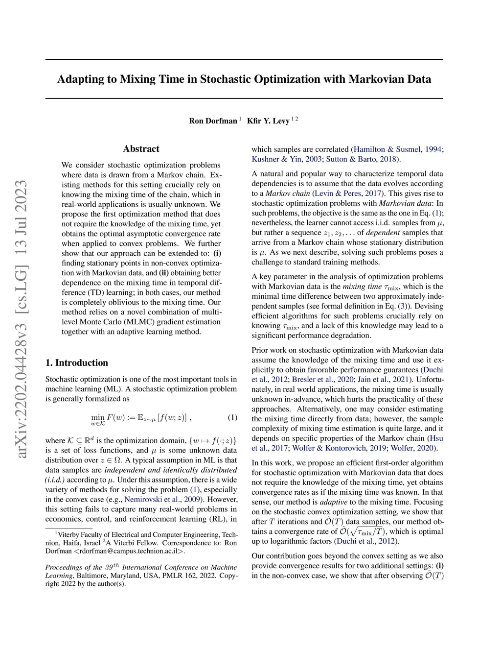 We consider stochastic optimization problems where data is drawn from a Markov chain. Existing methods for this setting crucially rely on knowing the mixing time of the chain, which in real-world applications is usually unknown. We propose the first optimization method that does not require the knowledge of the mixing time, yet obtains the optimal asymptotic convergence rate when applied to convex problems. We further show that our approach can be extended to: (i) finding stationary points in non-convex optimization with Markovian data, and (ii) obtaining better dependence on the mixing time in temporal difference (TD) learning; in both cases, our method is completely oblivious to the mixing time. Our method relies on a novel combination of multi-level Monte Carlo (MLMC) gradient estimation together with an adaptive learning method.