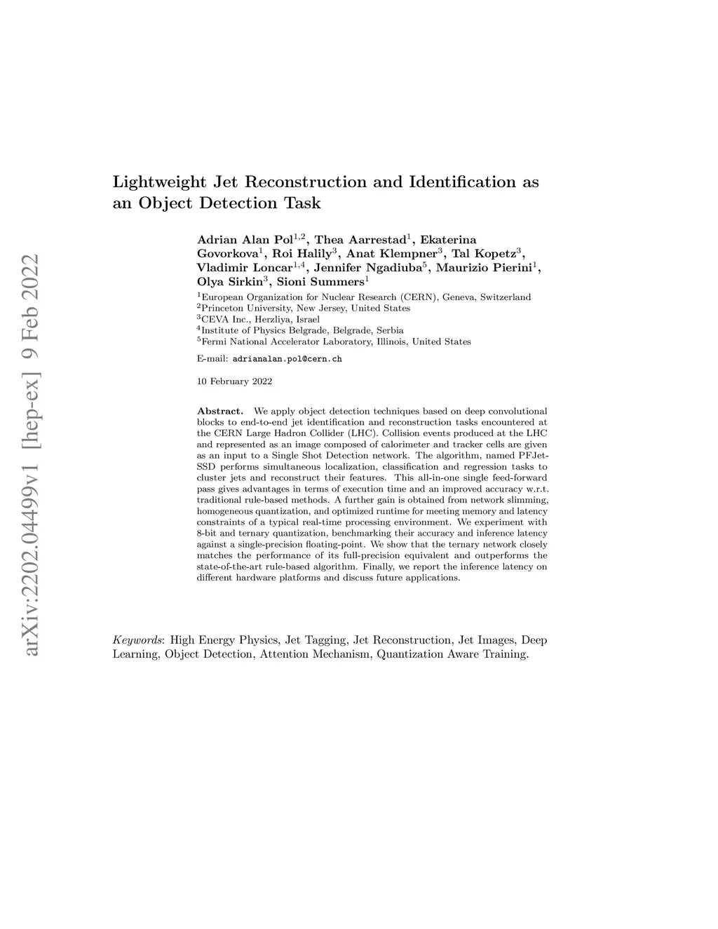 We apply object detection techniques based on deep convolutional blocks to end-to-end jet identification and reconstruction tasks encountered at the CERN Large Hadron Collider (LHC). Collision events produced at the LHC and represented as an image composed of calorimeter and tracker cells are given as an input to a Single Shot Detection network. The algorithm, named PFJet-SSD performs simultaneous localization, classification and regression tasks to cluster jets and reconstruct their features. This all-in-one single feed-forward pass gives advantages in terms of execution time and an improved accuracy w.r.t. traditional rule-based methods. A further gain is obtained from network slimming, homogeneous quantization, and optimized runtime for meeting memory and latency constraints of a typical real-time processing environment. We experiment with 8-bit and ternary quantization, benchmarking their accuracy and inference latency against a single-precision floating-point. We show that the ternary network closely matches the performance of its full-precision equivalent and outperforms the state-of-the-art rule-based algorithm. Finally, we report the inference latency on different hardware platforms and discuss future applications.