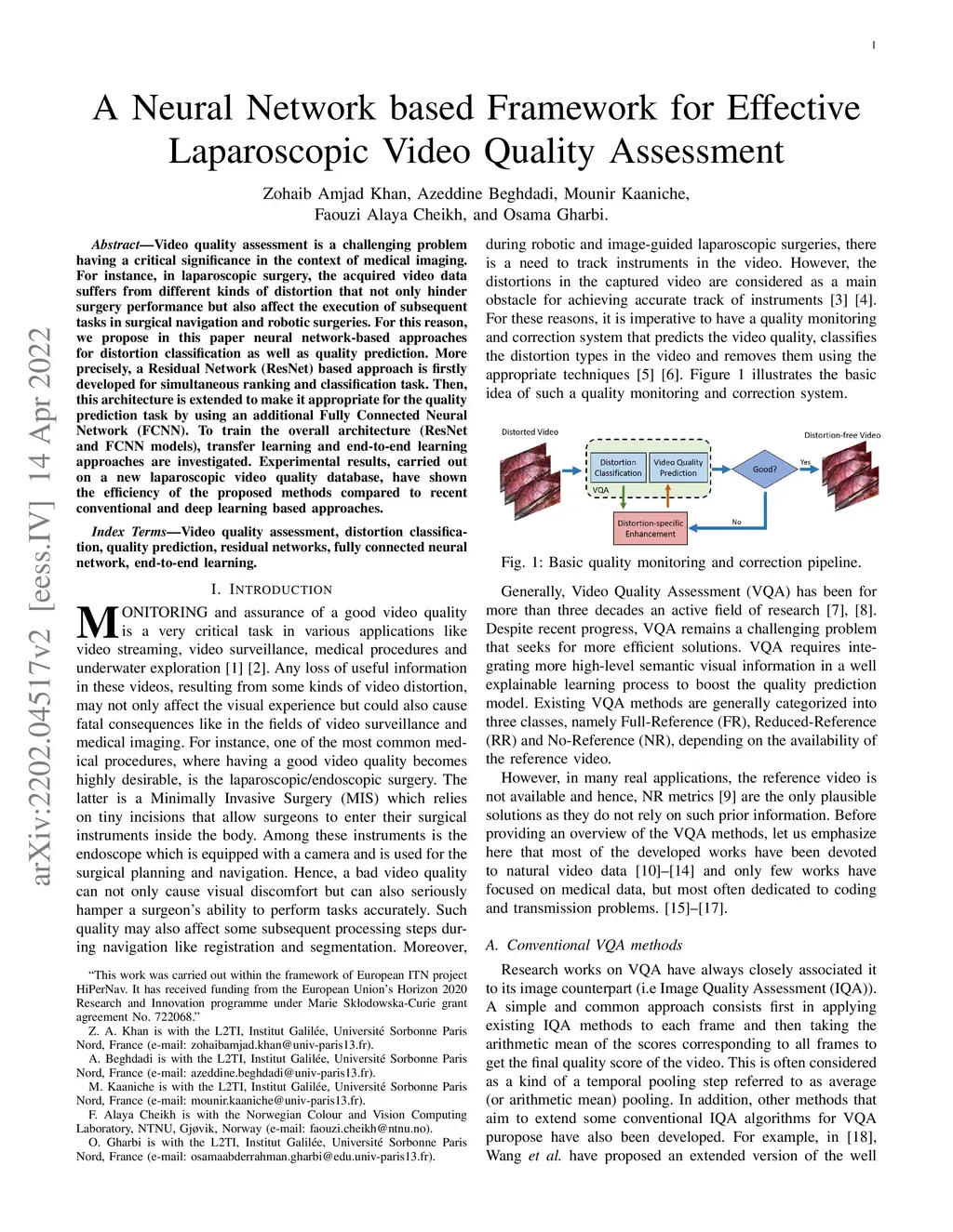 Video quality assessment is a challenging problem having a critical significance in the context of medical imaging. For instance, in laparoscopic surgery, the acquired video data suffers from different kinds of distortion that not only hinder surgery performance but also affect the execution of subsequent tasks in surgical navigation and robotic surgeries. For this reason, we propose in this paper neural network-based approaches for distortion classification as well as quality prediction. More precisely, a Residual Network (ResNet) based approach is firstly developed for simultaneous ranking and classification task. Then, this architecture is extended to make it appropriate for the quality prediction task by using an additional Fully Connected Neural Network (FCNN). To train the overall architecture (ResNet and FCNN models), transfer learning and end-to-end learning approaches are investigated. Experimental results, carried out on a new laparoscopic video quality database, have shown the efficiency of the proposed methods compared to recent conventional and deep learning based approaches.