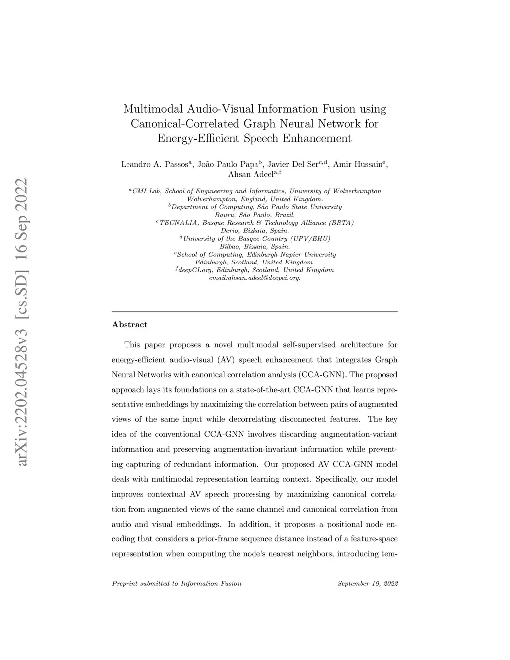 This paper proposes a novel multimodal self-supervised architecture for energy-efficient audio-visual (AV) speech enhancement that integrates Graph Neural Networks with canonical correlation analysis (CCA-GNN). The proposed approach lays its foundations on a state-of-the-art CCA-GNN that learns representative embeddings by maximizing the correlation between pairs of augmented views of the same input while decorrelating disconnected features. The key idea of the conventional CCA-GNN involves discarding augmentation-variant information and preserving augmentation-invariant information while preventing capturing of redundant information. Our proposed AV CCA-GNN model deals with multimodal representation learning context. Specifically, our model improves contextual AV speech processing by maximizing canonical correlation from augmented views of the same channel and canonical correlation from audio and visual embeddings. In addition, it proposes a positional node encoding that considers a prior-frame sequence distance instead of a feature-space representation when computing the node's nearest neighbors, introducing temporal information in the embeddings through the neighborhood's connectivity. Experiments conducted on the benchmark ChiME3 dataset show that our proposed prior frame-based AV CCA-GNN ensures better feature learning in the temporal context, leading to more energy-efficient speech reconstruction than state-of-the-art CCA-GNN and multilayer perceptron.