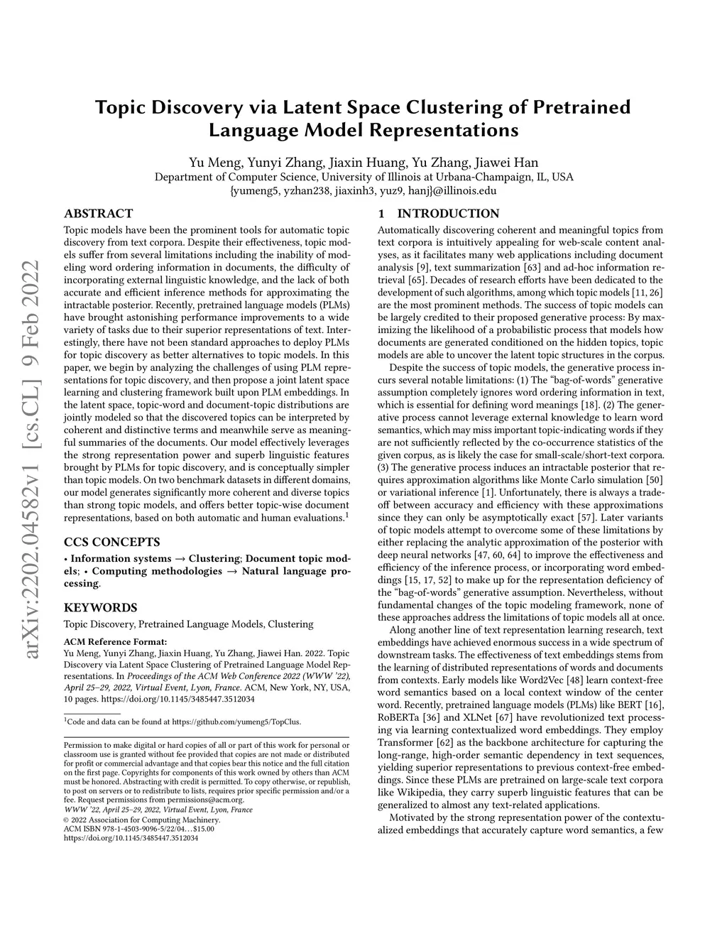 Topic Discovery via Latent Space Clustering of Pretrained Language Model