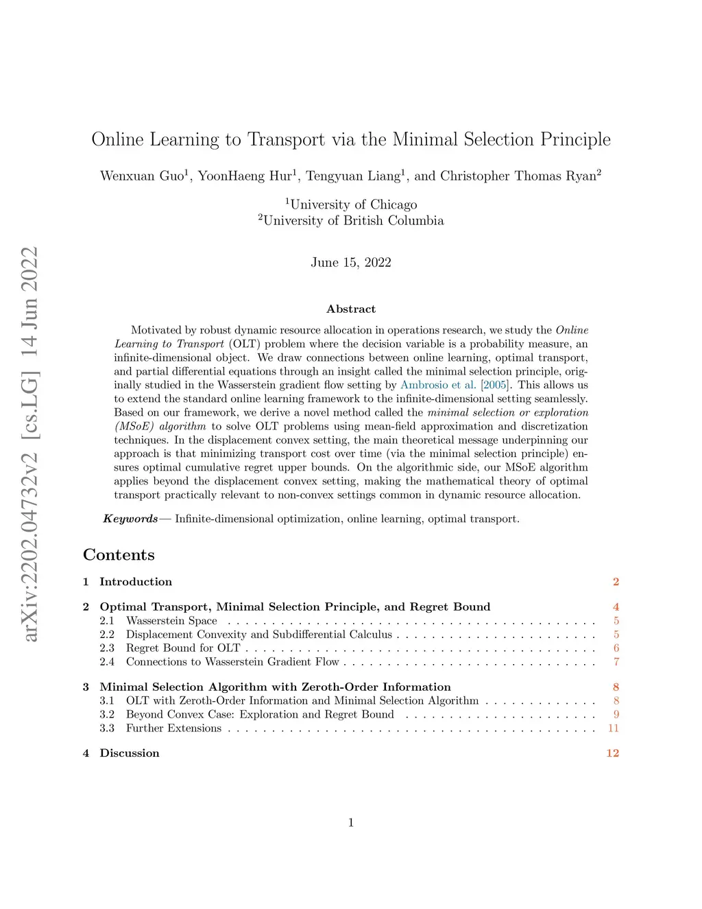 Motivated by robust dynamic resource allocation in operations research, we study the \textit{Online Learning to Transport} (OLT) problem where the decision variable is a probability measure, an infinite-dimensional object. We draw connections between online learning, optimal transport, and partial differential equations through an insight called the minimal selection principle, originally studied in the Wasserstein gradient flow setting by \citet{Ambrosio_2005}. This allows us to extend the standard online learning framework to the infinite-dimensional setting seamlessly. Based on our framework, we derive a novel method called the \textit{minimal selection or exploration (MSoE) algorithm} to solve OLT problems using mean-field approximation and discretization techniques. In the displacement convex setting, the main theoretical message underpinning our approach is that minimizing transport cost over time (via the minimal selection principle) ensures optimal cumulative regret upper bounds. On the algorithmic side, our MSoE algorithm applies beyond the displacement convex setting, making the mathematical theory of optimal transport practically relevant to non-convex settings common in dynamic resource allocation.