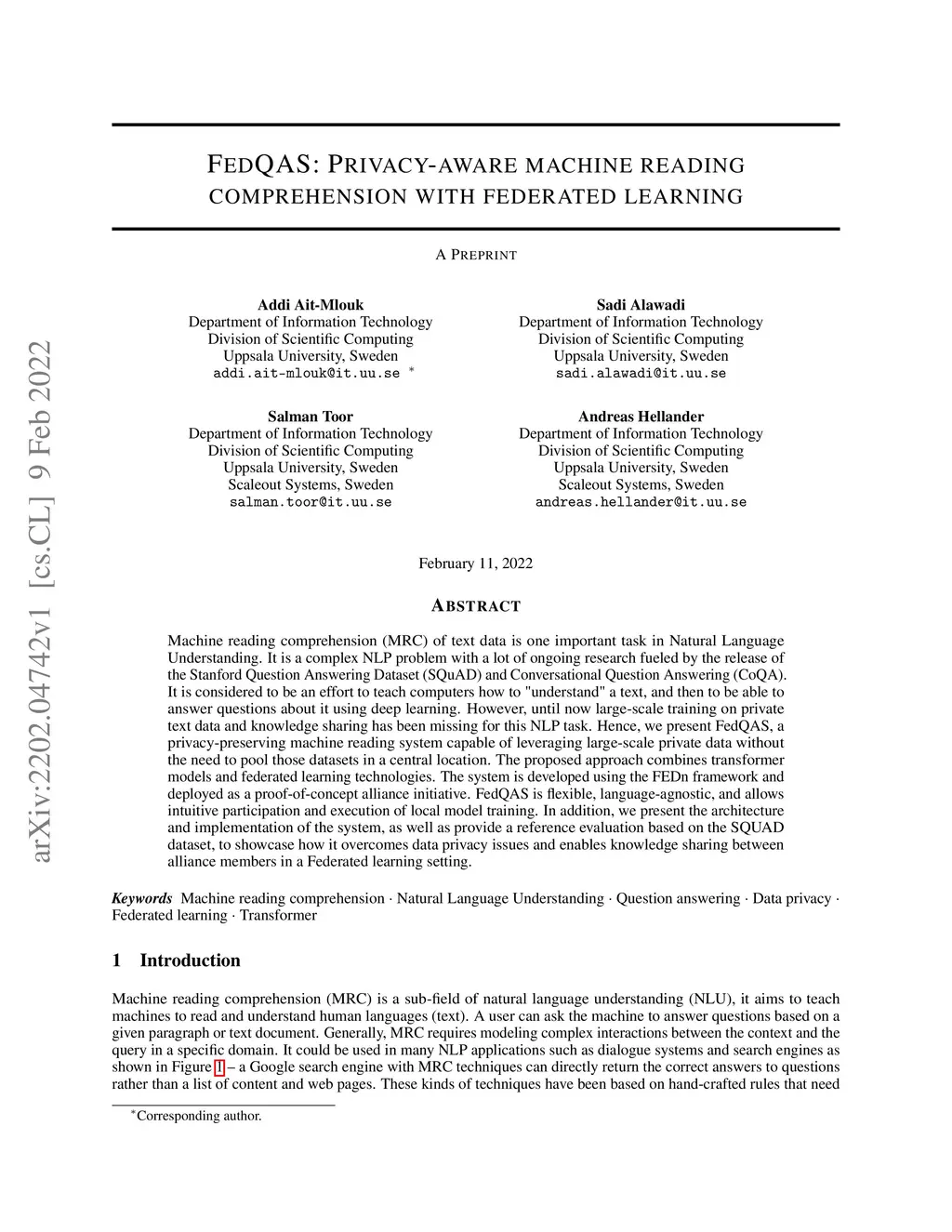 FedQAS: Privacy-aware machine reading comprehension with federated