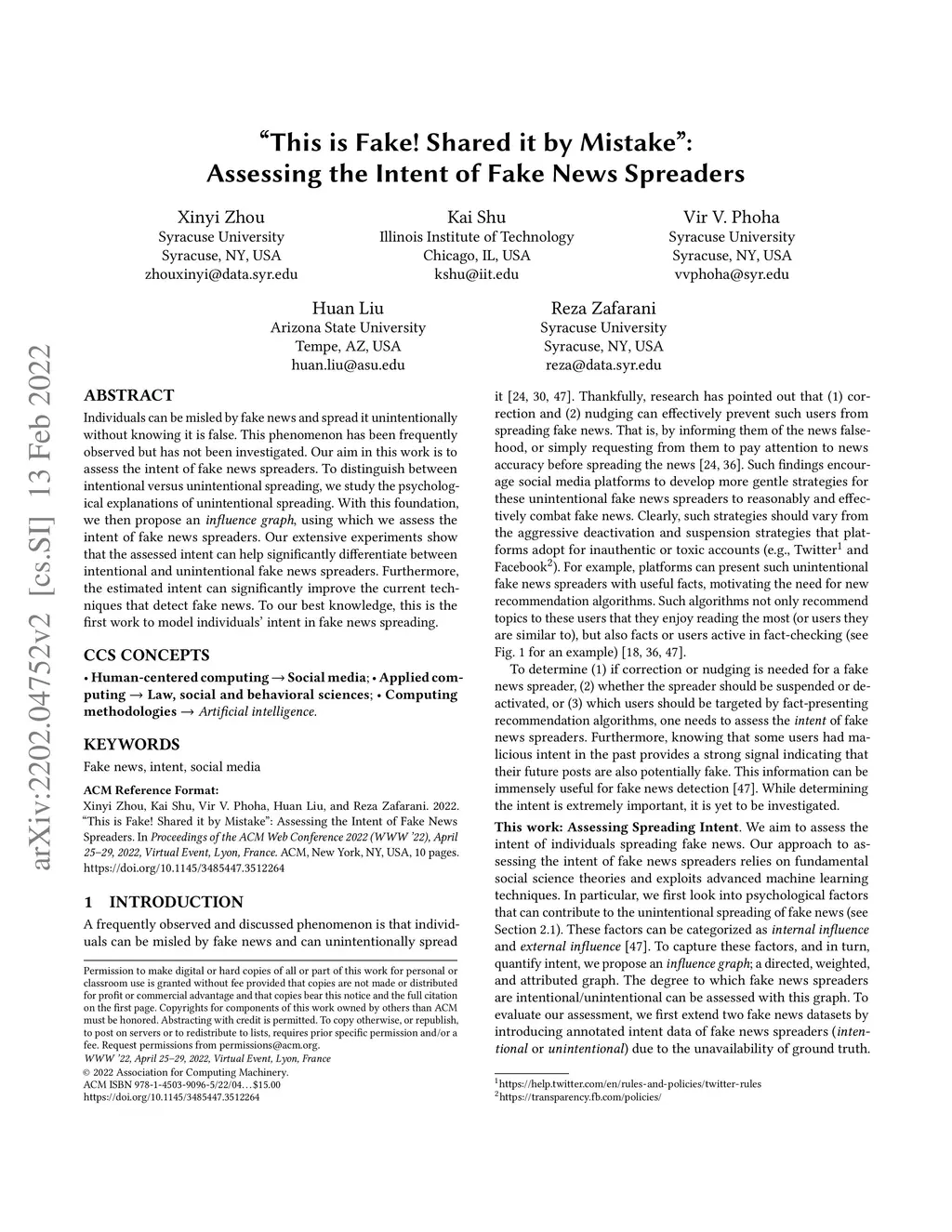 Individuals can be misled by fake news and spread it unintentionally without knowing it is false. This phenomenon has been frequently observed but has not been investigated. Our aim in this work is to assess the intent of fake news spreaders. To distinguish between intentional versus unintentional spreading, we study the psychological explanations of unintentional spreading. With this foundation, we then propose an influence graph, using which we assess the intent of fake news spreaders. Our extensive experiments show that the assessed intent can help significantly differentiate between intentional and unintentional fake news spreaders. Furthermore, the estimated intent can significantly improve the current techniques that detect fake news. To our best knowledge, this is the first work to model individuals' intent in fake news spreading.