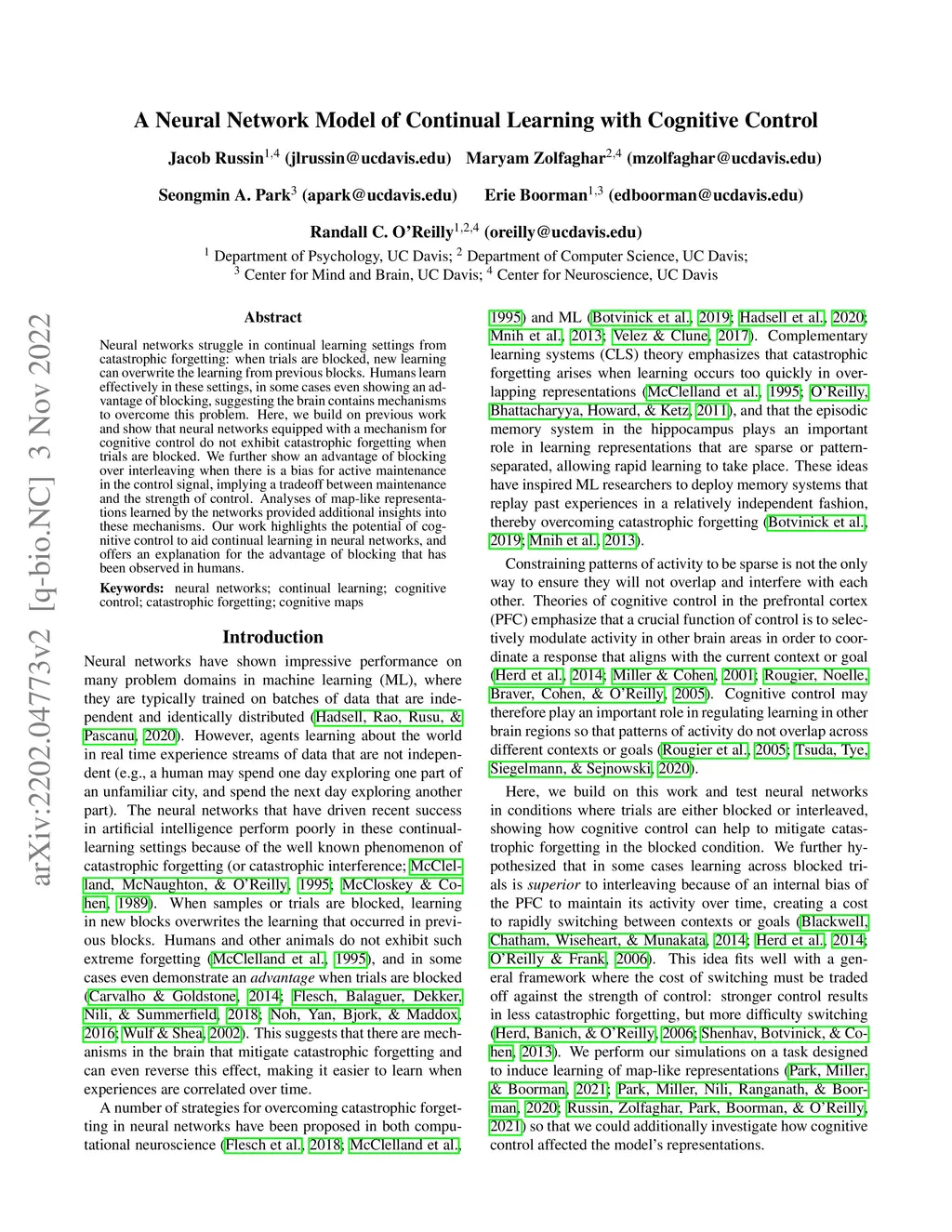 A Neural Network Model of Continual Learning with Cognitive Control