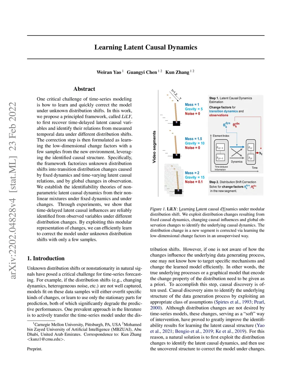 One critical challenge of time-series modeling is how to learn and quickly correct the model under unknown distribution shifts. In this work, we propose a principled framework, called LiLY, to first recover time-delayed latent causal variables and identify their relations from measured temporal data under different distribution shifts. The correction step is then formulated as learning the low-dimensional change factors with a few samples from the new environment, leveraging the identified causal structure. Specifically, the framework factorizes unknown distribution shifts into transition distribution changes caused by fixed dynamics and time-varying latent causal relations, and by global changes in observation. We establish the identifiability theories of nonparametric latent causal dynamics from their nonlinear mixtures under fixed dynamics and under changes. Through experiments, we show that time-delayed latent causal influences are reliably identified from observed variables under different distribution changes. By exploiting this modular representation of changes, we can efficiently learn to correct the model under unknown distribution shifts with only a few samples.