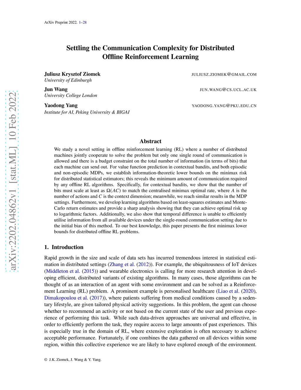 We study a novel setting in offline reinforcement learning (RL) where a number of distributed machines jointly cooperate to solve the problem but only one single round of communication is allowed and there is a budget constraint on the total number of information (in terms of bits) that each machine can send out. For value function prediction in contextual bandits, and both episodic and non-episodic MDPs, we establish information-theoretic lower bounds on the minimax risk for distributed statistical estimators; this reveals the minimum amount of communication required by any offline RL algorithms. Specifically, for contextual bandits, we show that the number of bits must scale at least as to match the centralised minimax optimal rate, where is the number of actions and is the context dimension; meanwhile, we reach similar results in the MDP settings. Furthermore, we develop learning algorithms based on least-squares estimates and Monte-Carlo return estimates and provide a sharp analysis showing that they can achieve optimal risk up to logarithmic factors. Additionally, we also show that temporal difference is unable to efficiently utilise information from all available devices under the single-round communication setting due to the initial bias of this method. To our best knowledge, this paper presents the first minimax lower bounds for distributed offline RL problems.
