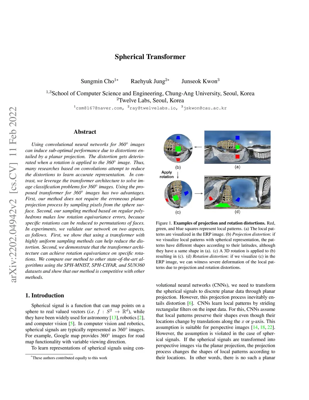 Using convolutional neural networks for 360images can induce sub-optimal performance due to distortions entailed by a planar projection. The distortion gets deteriorated when a rotation is applied to the 360image. Thus, many researches based on convolutions attempt to reduce the distortions to learn accurate representation. In contrast, we leverage the transformer architecture to solve image classification problems for 360images. Using the proposed transformer for 360images has two advantages. First, our method does not require the erroneous planar projection process by sampling pixels from the sphere surface. Second, our sampling method based on regular polyhedrons makes low rotation equivariance errors, because specific rotations can be reduced to permutations of faces. In experiments, we validate our network on two aspects, as follows. First, we show that using a transformer with highly uniform sampling methods can help reduce the distortion. Second, we demonstrate that the transformer architecture can achieve rotation equivariance on specific rotations. We compare our method to other state-of-the-art algorithms using the SPH-MNIST, SPH-CIFAR, and SUN360 datasets and show that our method is competitive with other methods.